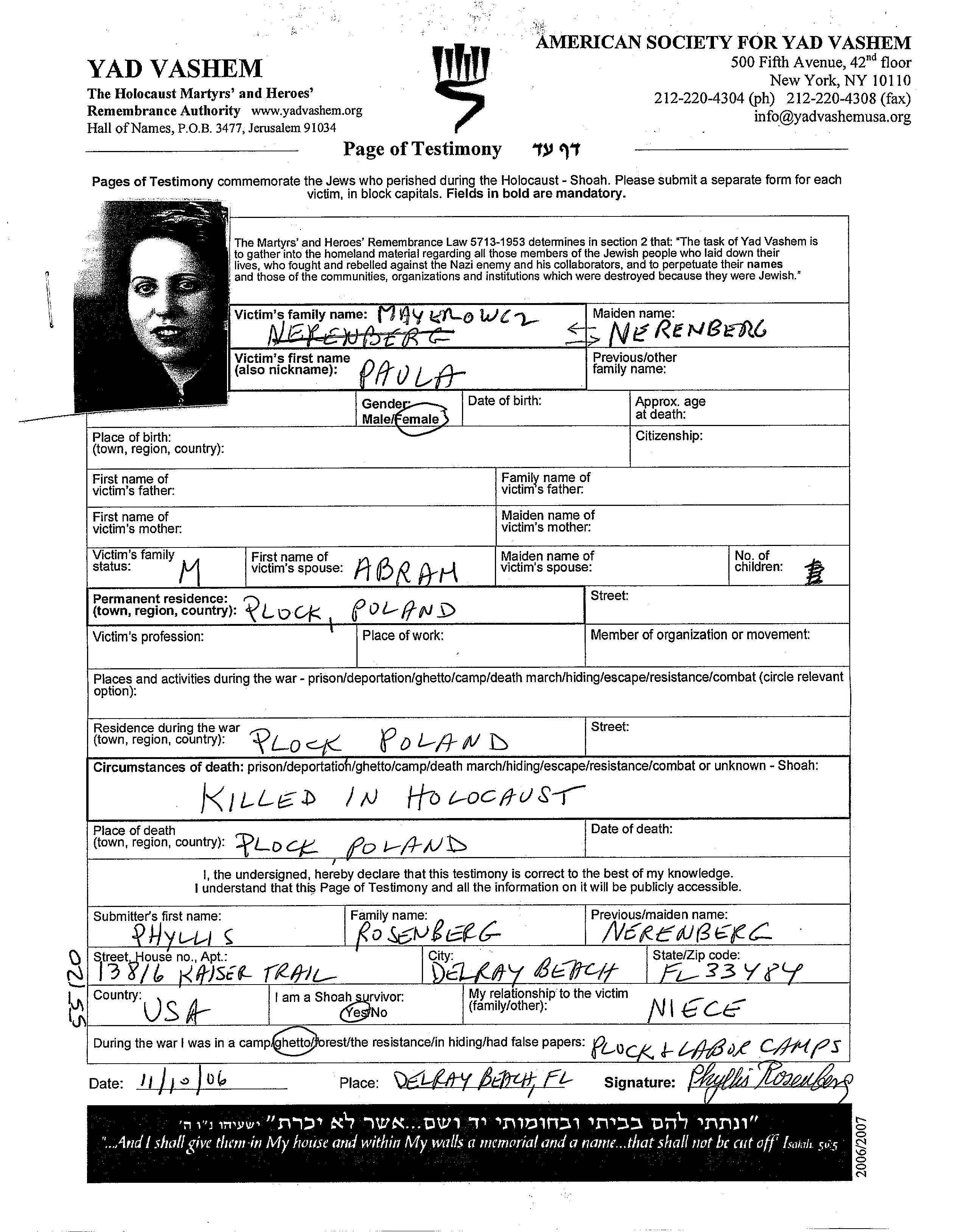 Nerenberg Paula Plock, Pologne Feuille de témoignage
