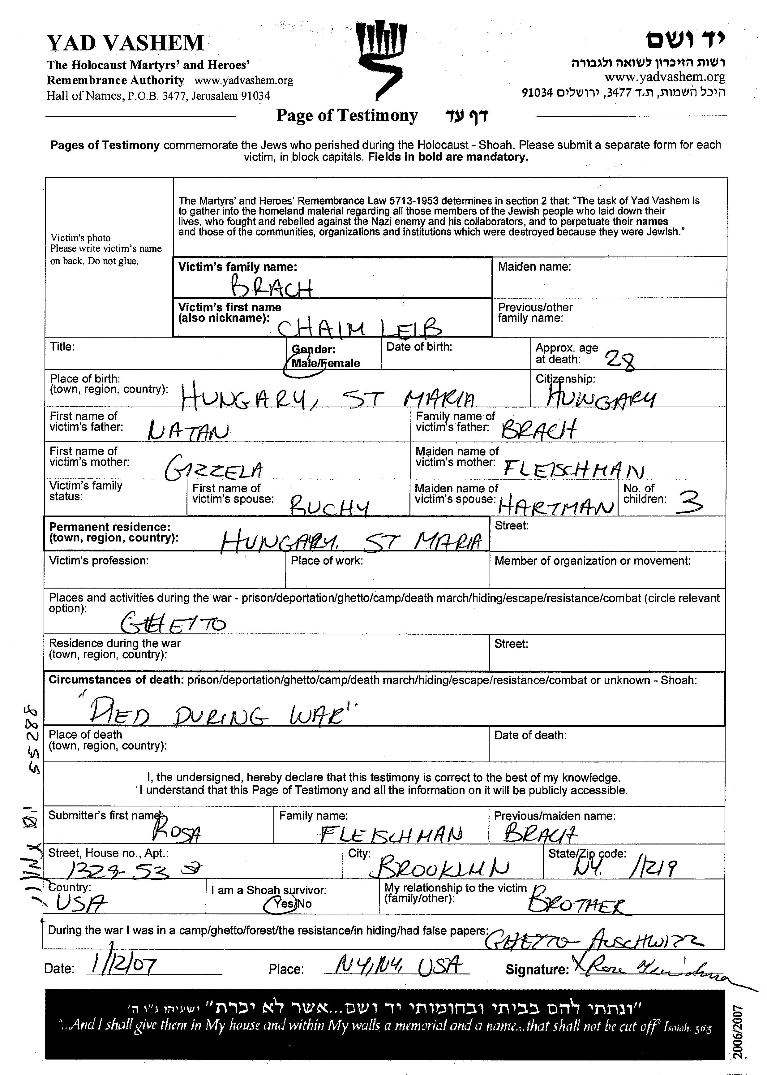 Brach | Leib Chaim | Hongrie | Feuille de témoignage | |