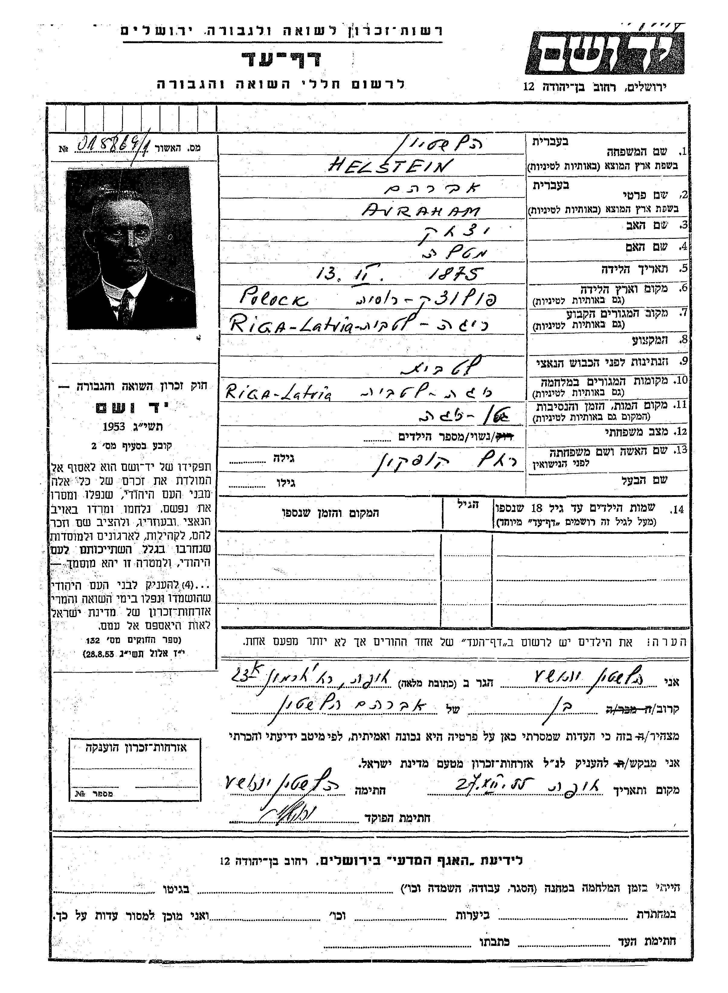 Avraham Helstein est né à Polotsk, Bélorussie (URSS) en 1875. Avant la seconde guerre mondiale il vivait à Riga, Lettonie.