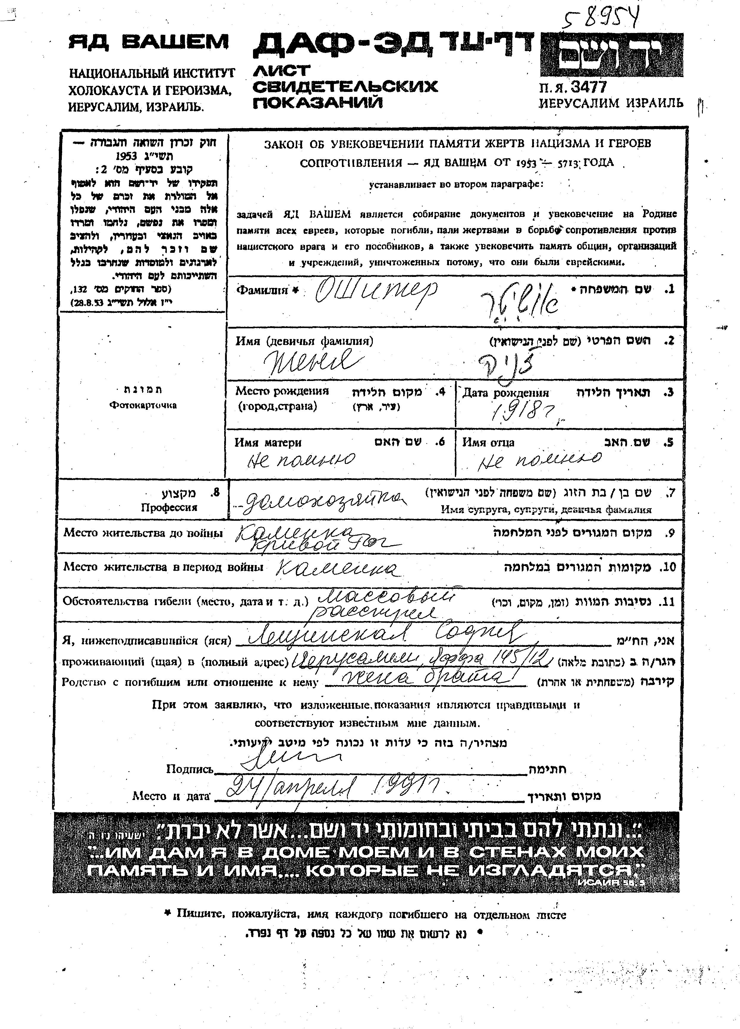 Oshiter Zhenia 1918 Krivoy Rog, Ukraine (URSS) Feuille de témoignage