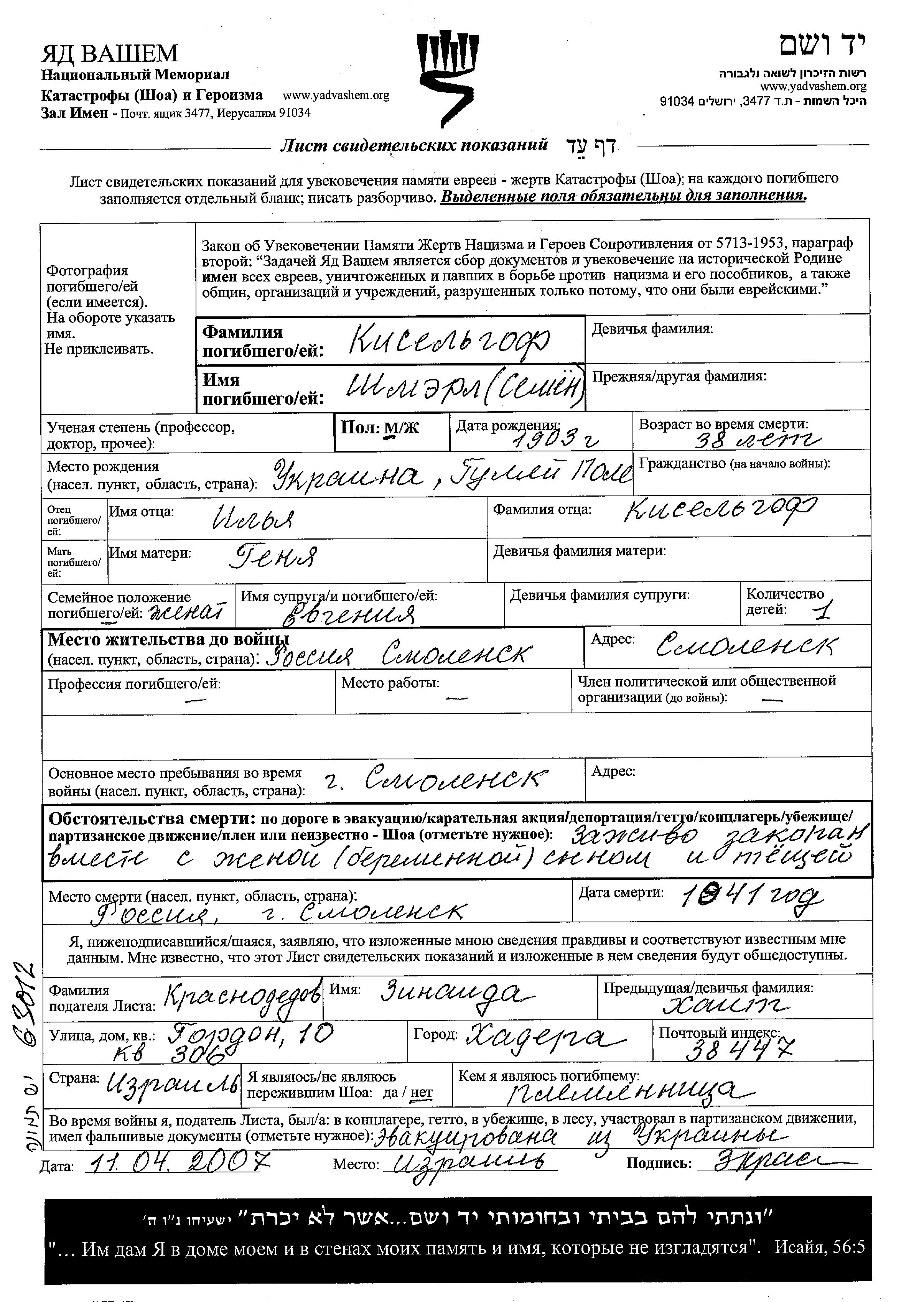 Kiselgof Semyon Shmerl 1903 Smolensk, Russie (URSS) Feuille de témoignage