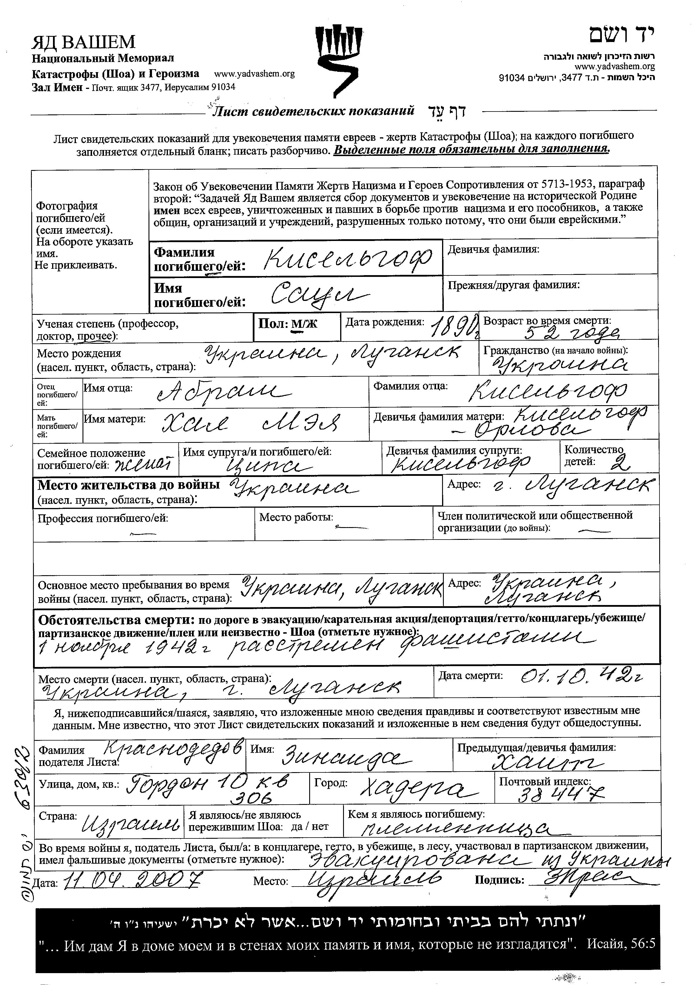 Kiselgof Saul 1890 Lugansk, Ukraine (URSS) Feuille de témoignage