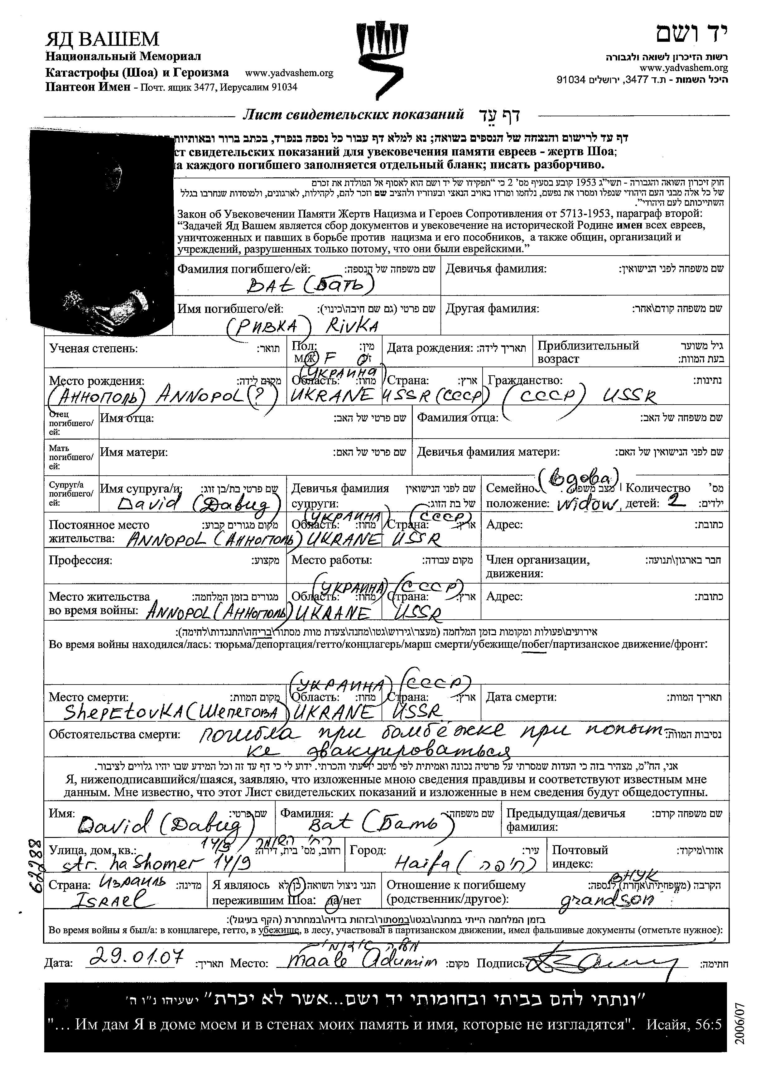 Bat Rivka Annopol, Ukraine (URSS) Feuille de témoignage