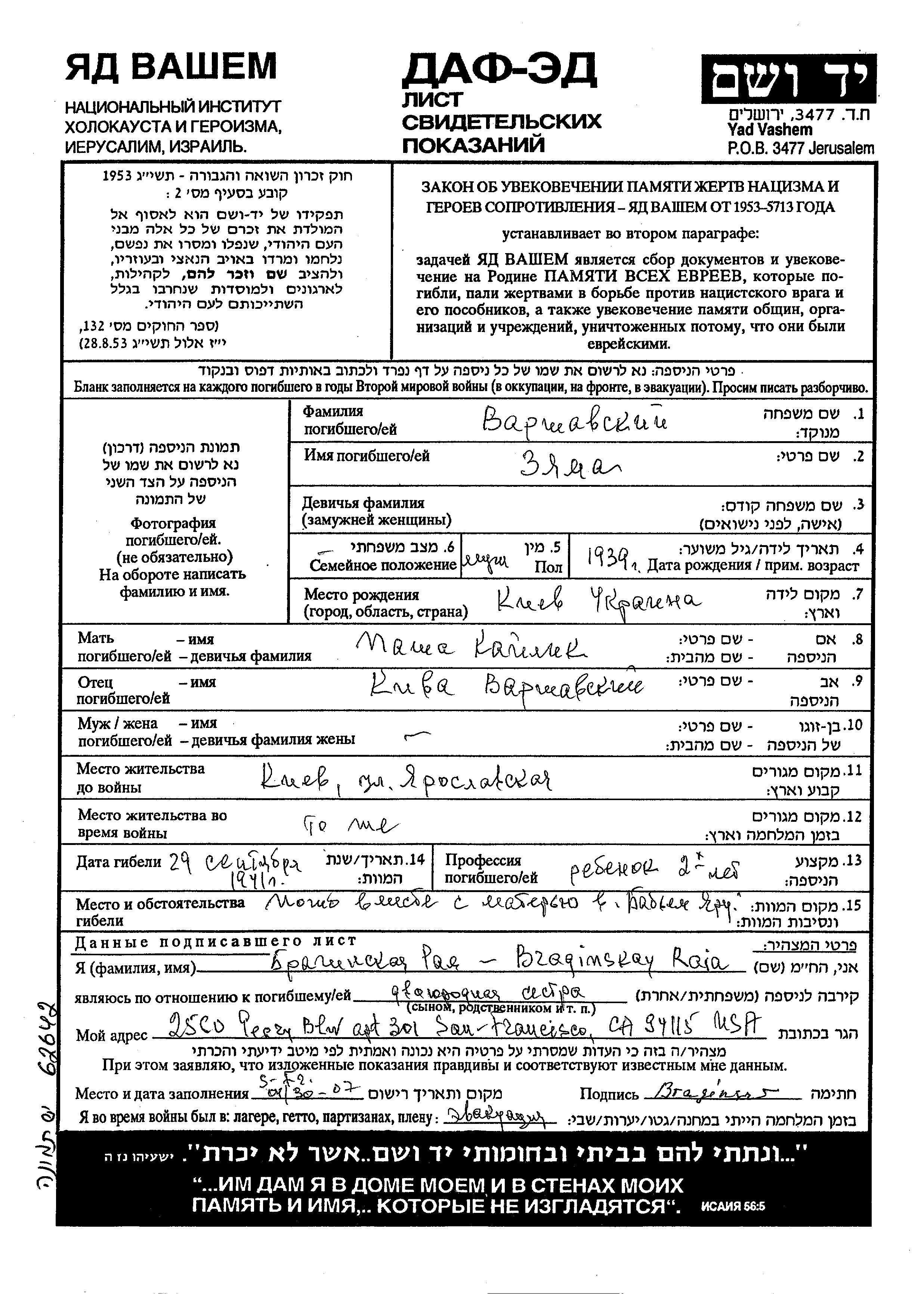 Varshavski | Zyama | 1939 | Kiev, Ukraine (URSS) | Feuille de témoignage |