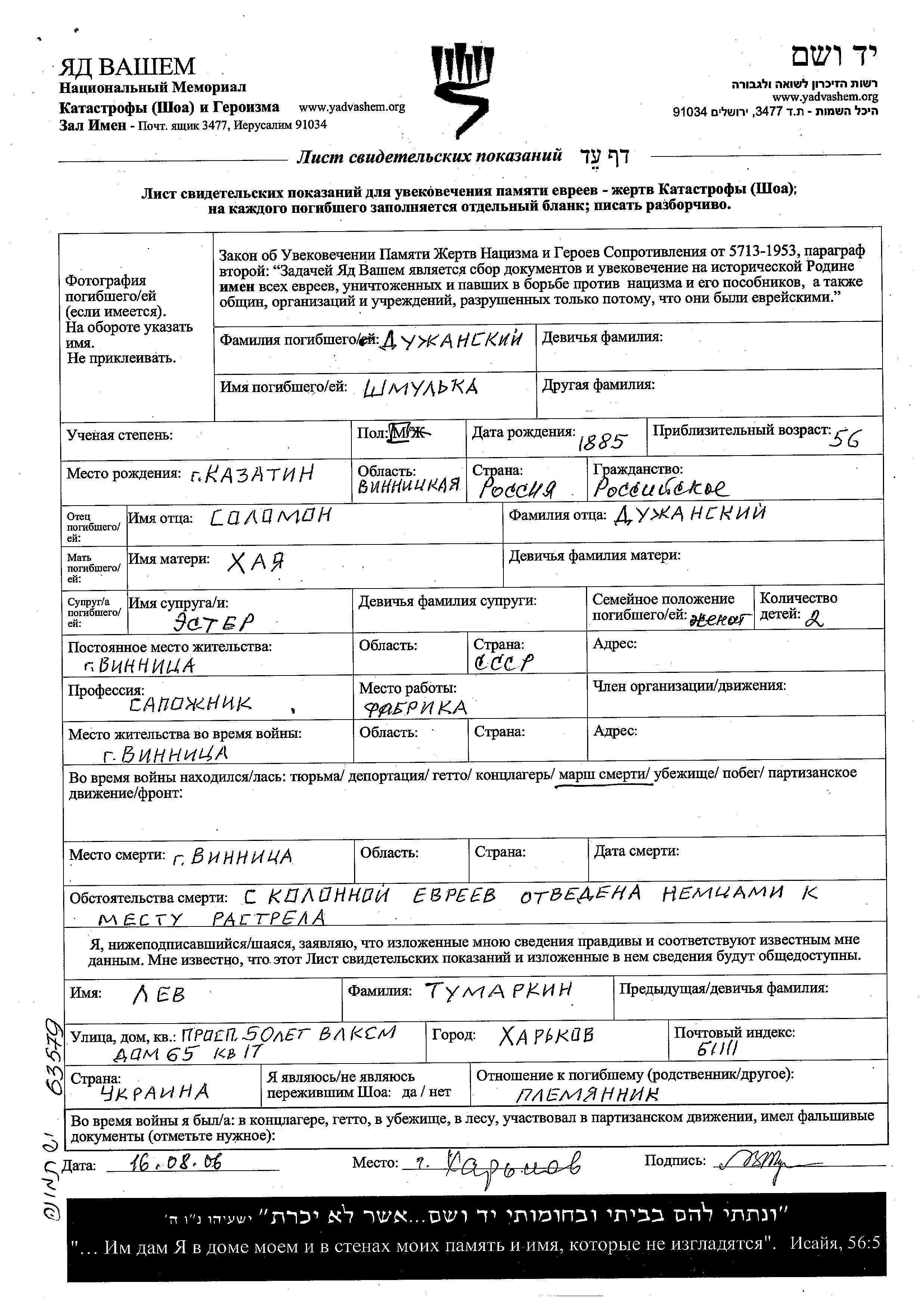 Duzhanski | Shmulka | 1885 | Vinnitsa, Ukraine (URSS) | Feuille de témoignage |