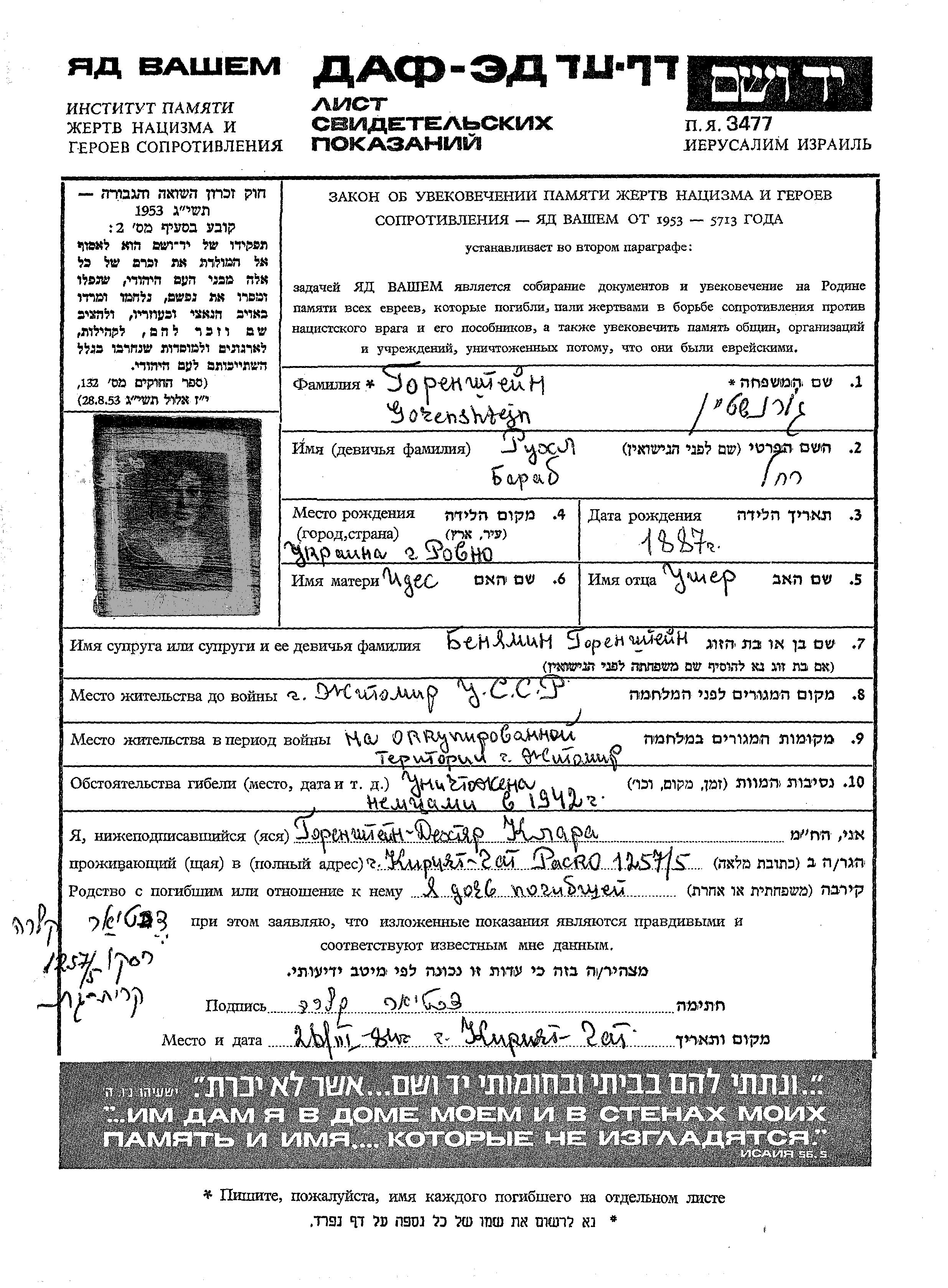 Gorenshtein Rukhl 1887 Zhitomir, Ukraine (URSS) Feuille de témoignage
