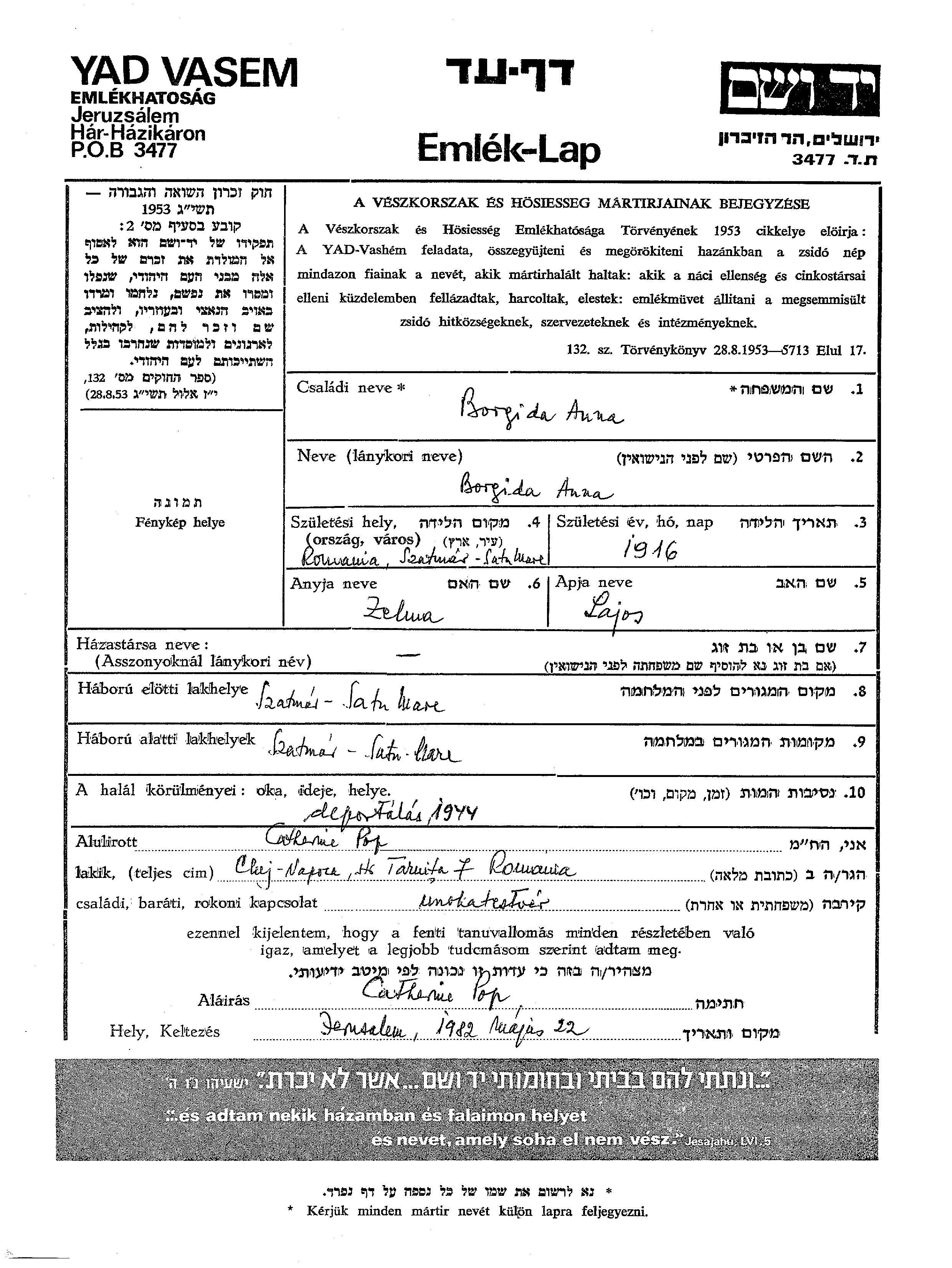 Borgida | Anna | 1916 | Szatmarnemeti, Roumanie | Feuille de témoignage |
