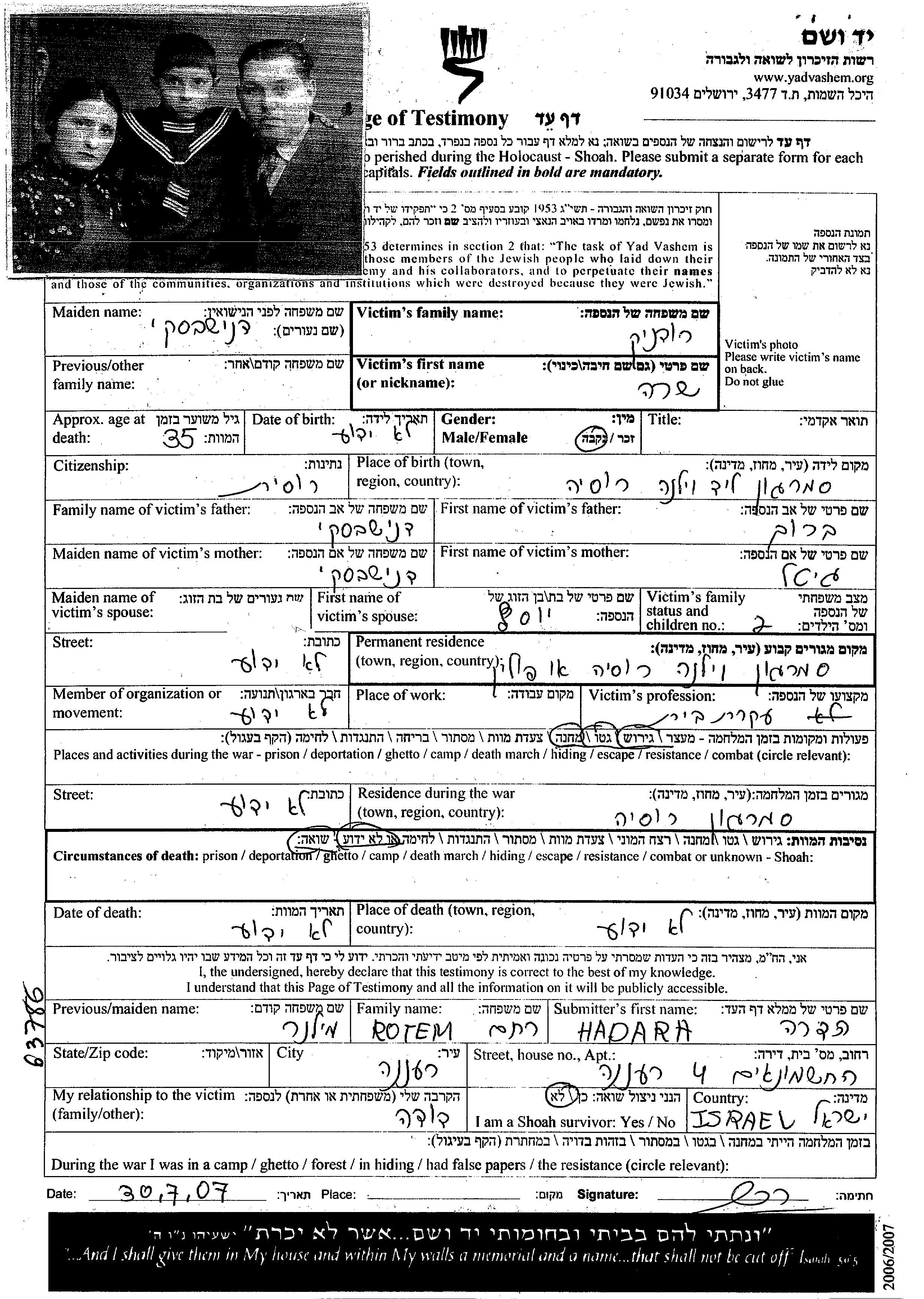 Yad Vashem - Pages of Testimony Names Memorial Collection