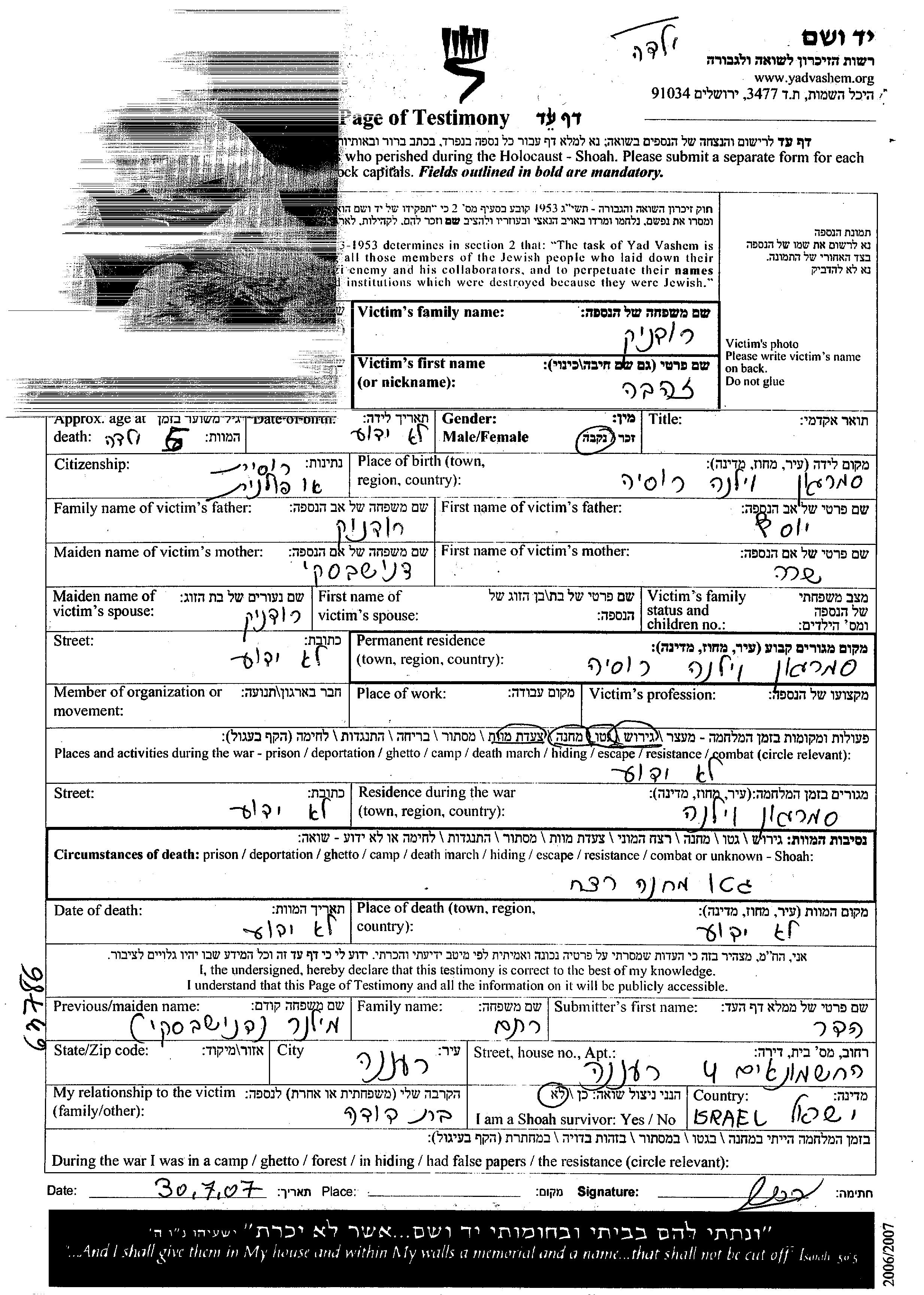 Yad Vashem - Pages of Testimony Names Memorial Collection