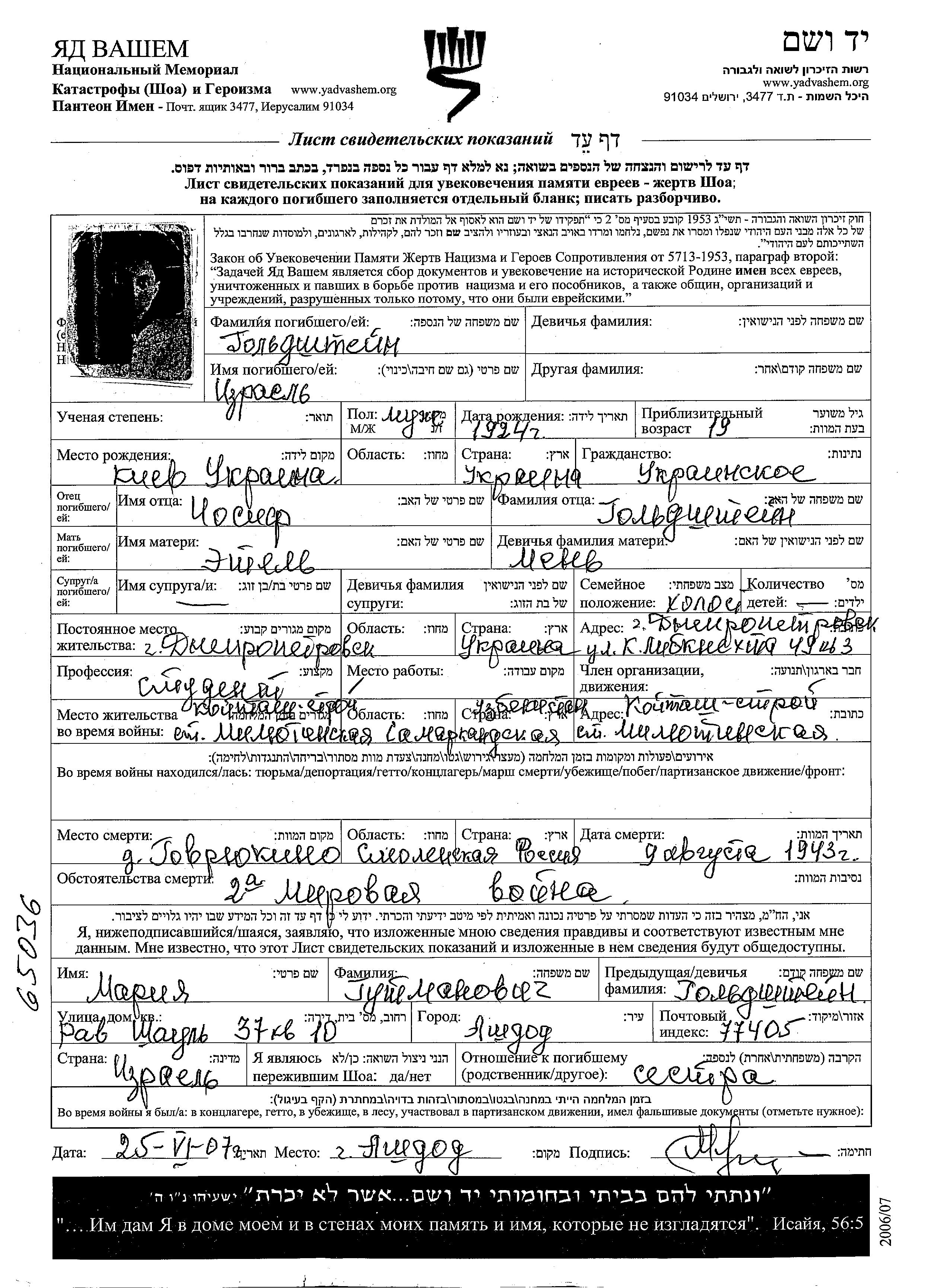 Goldshtein | Izrael | 1924 | Dnepropetrovsk, Ukraine (URSS) | Feuille de témoignage |