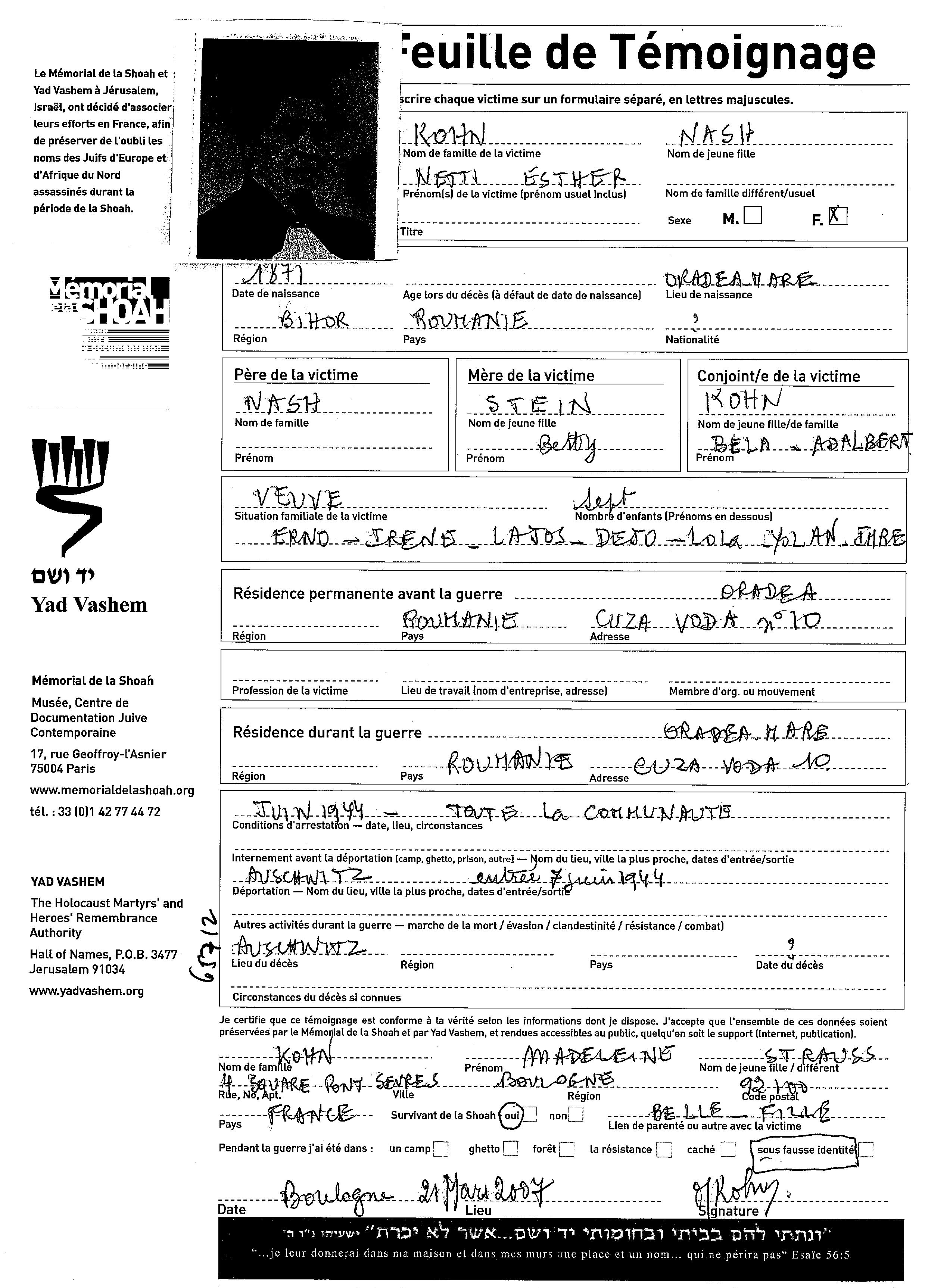 Netti Esther Kohn née Nash est née à Oradea, Roumanie en 1877. Avant la seconde guerre mondiale elle vivait à Oradea, Roumanie.
