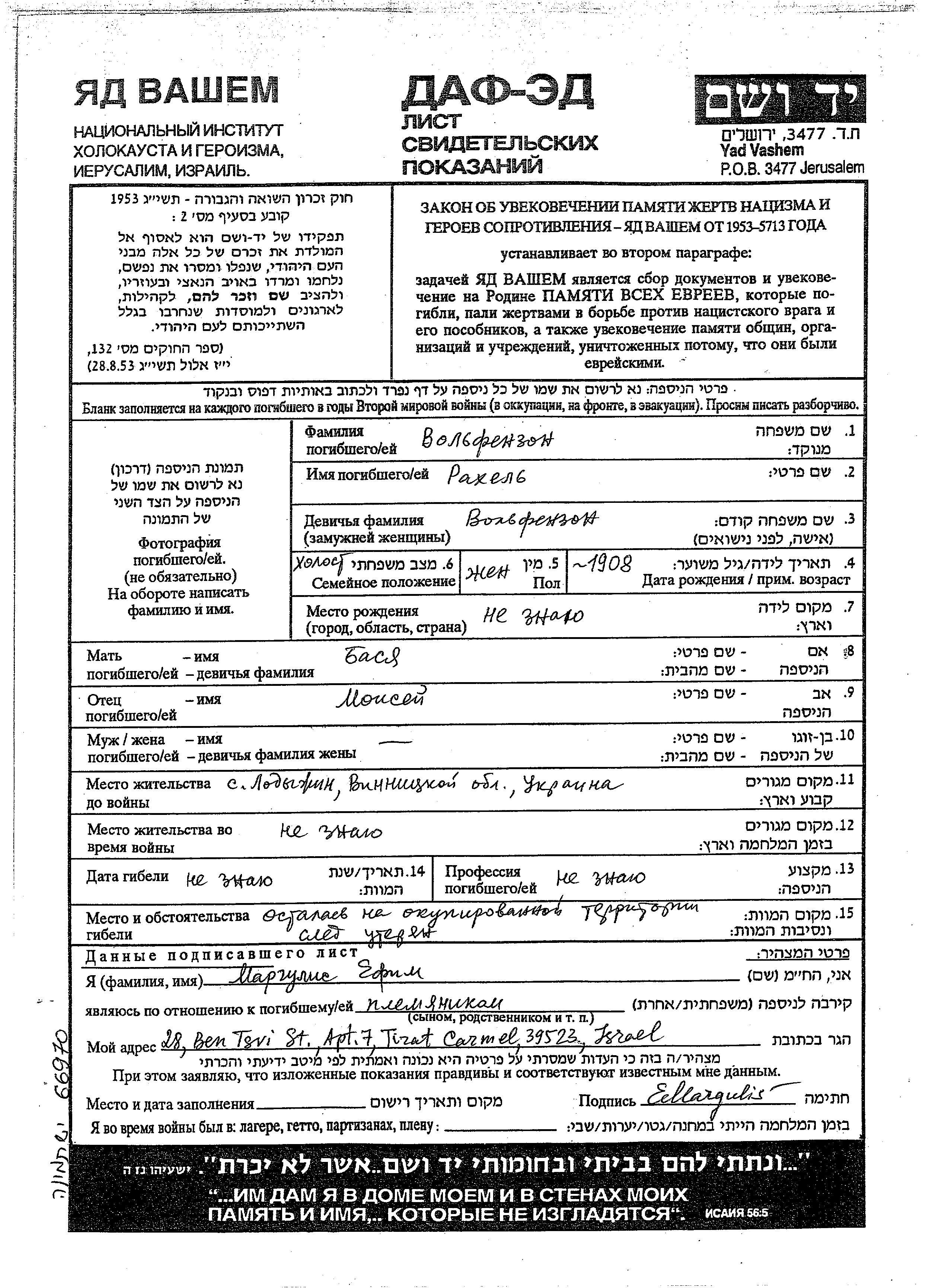 Volfenzon Rakhel 1908 Ladyzhin, Ukraine (URSS) Feuille de témoignage
