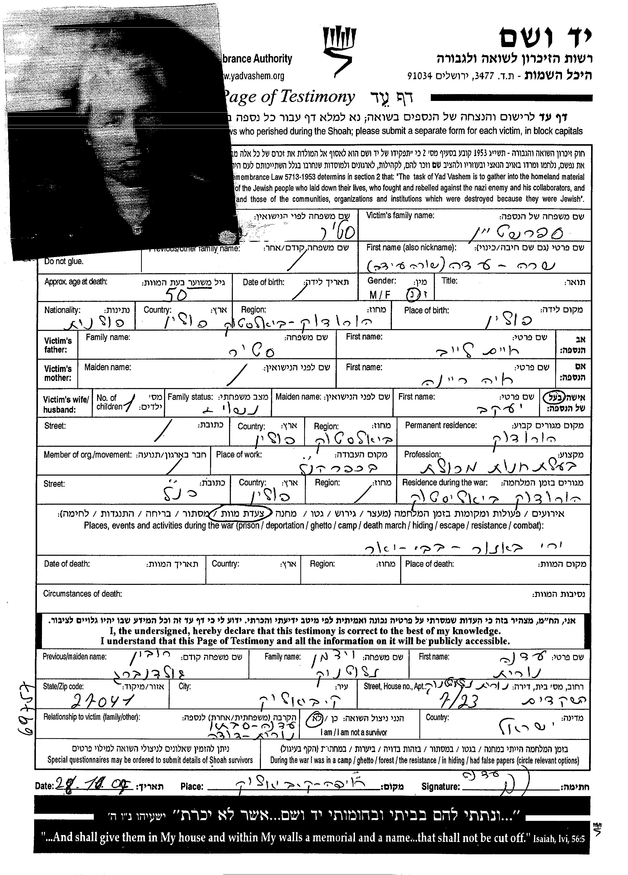 Sapershtein | Sara Ada Shura Ida | Horodok, Pologne | Feuille de témoignage | |