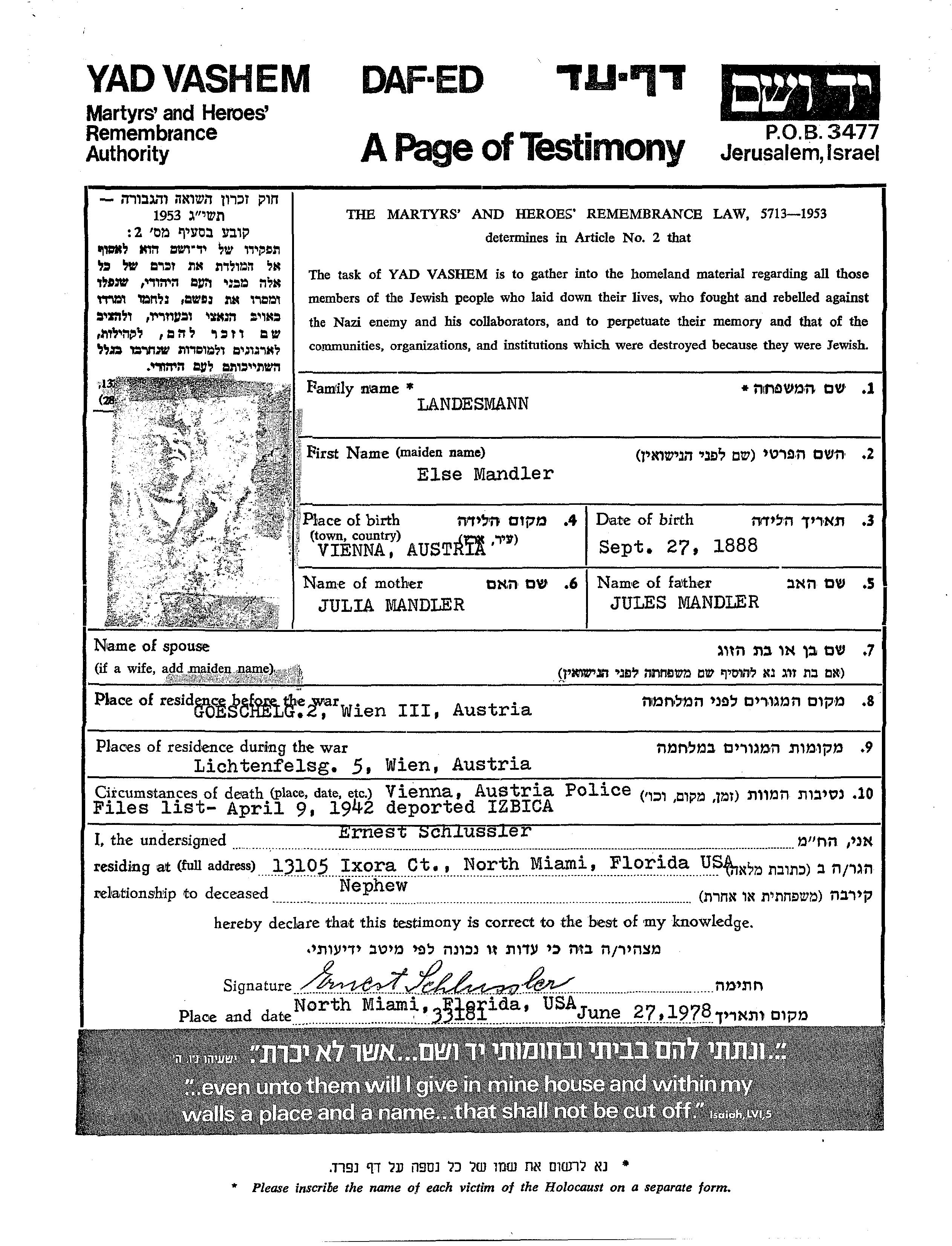 Else Landesmann née Mandler est née à Wien, Autriche en 1888. Avant la seconde guerre mondiale elle vivait à Wien, Autriche.