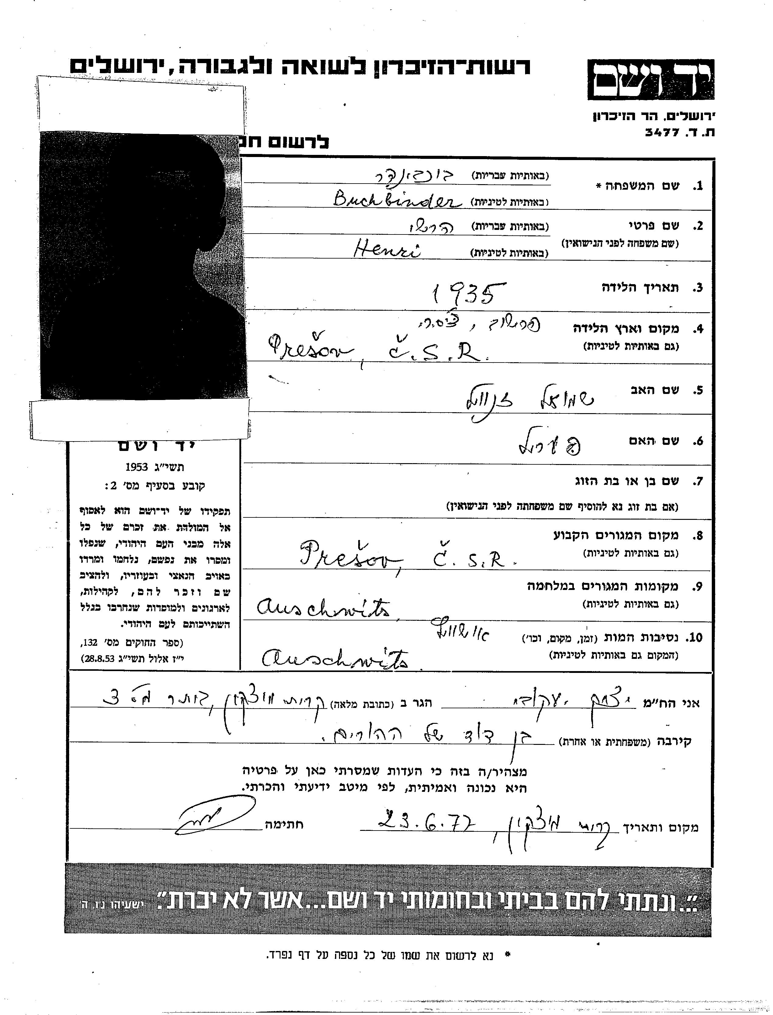 Henri Hirsh Buchbinder est né à Presov, Tchécoslovaquie en 1935. Avant la seconde guerre mondiale il vivait à Presov, Tchécoslovaquie.