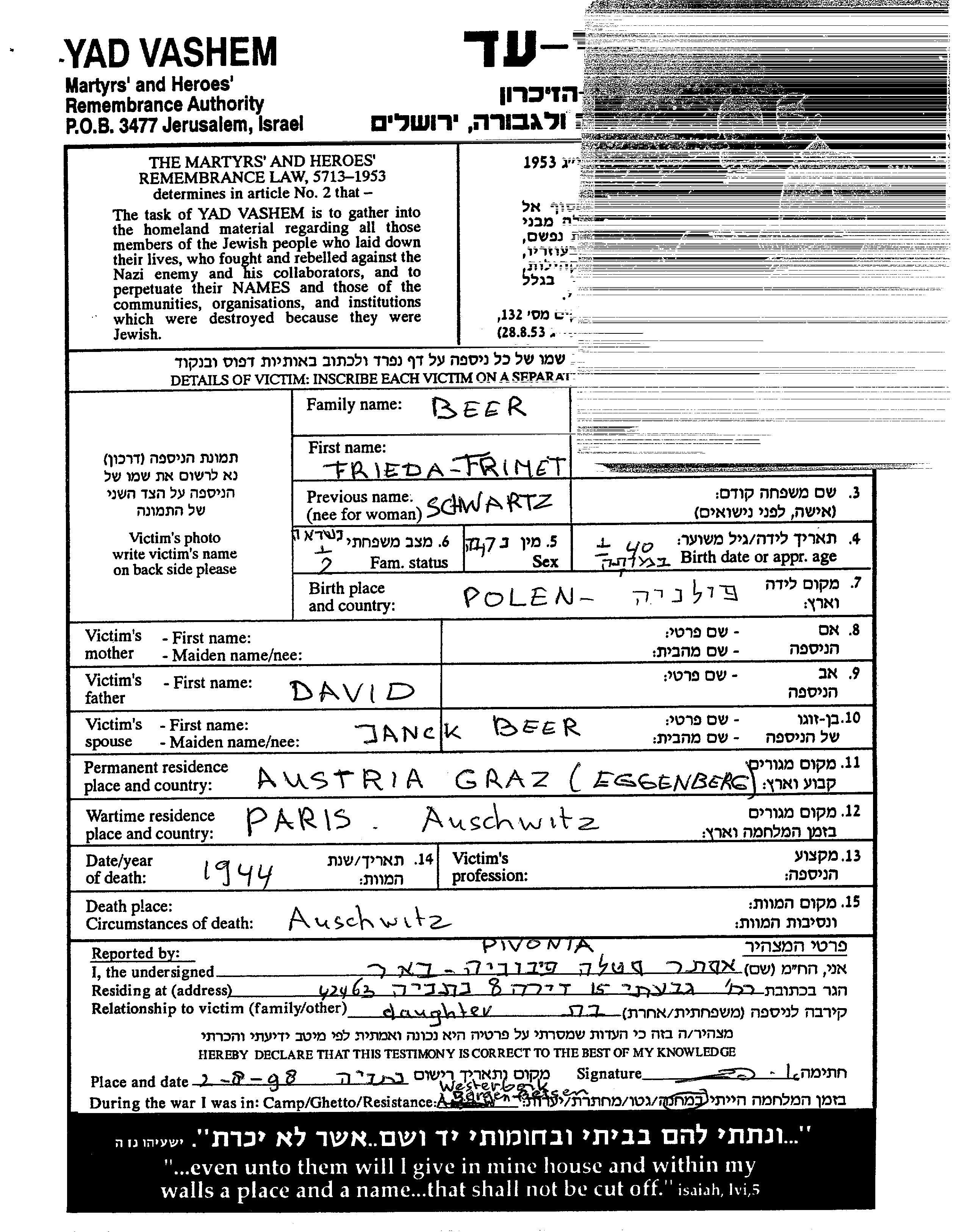 Yad Vashem - Pages of Testimony Names Memorial Collection