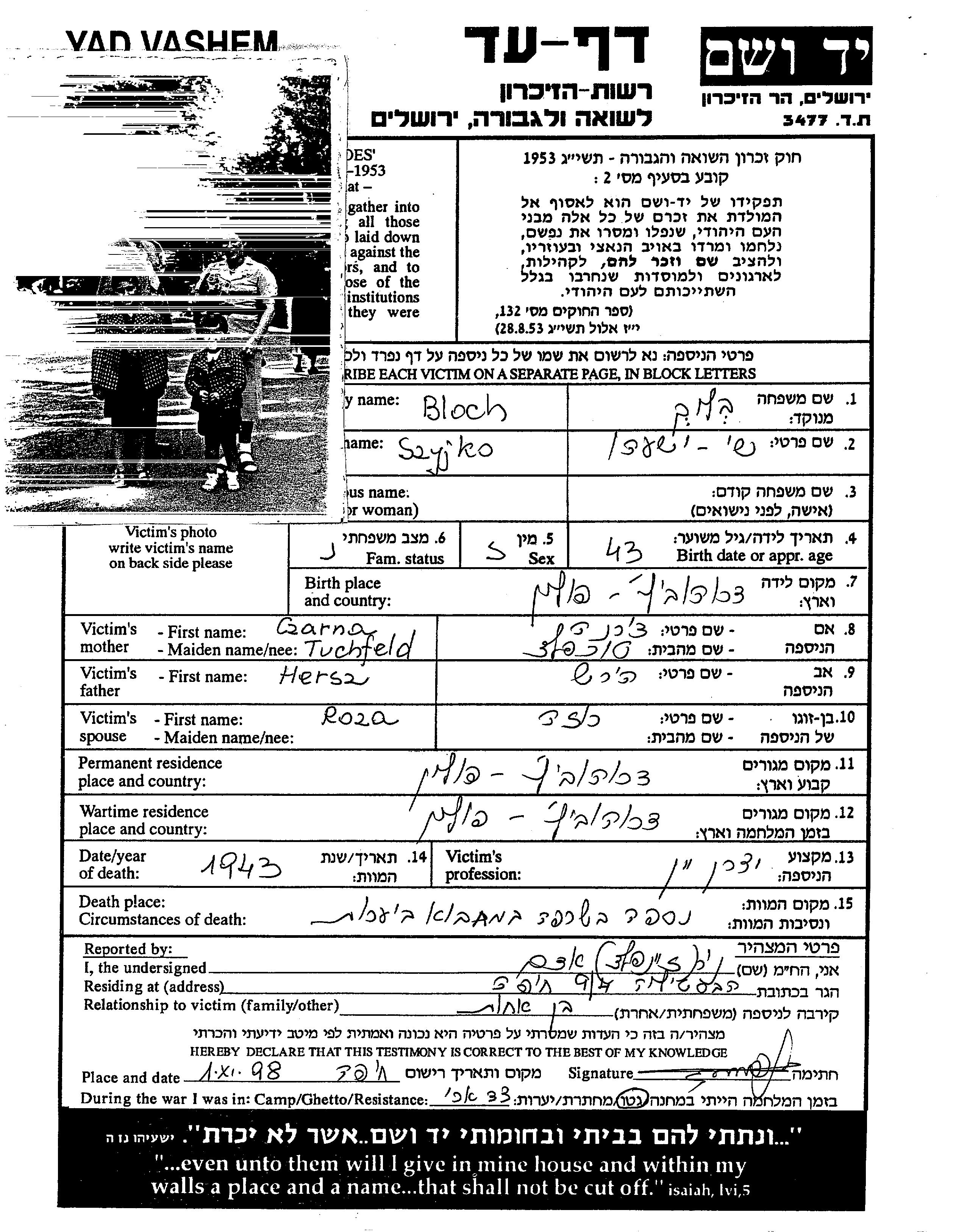 Bloch Szyjko Ieshaiahu Shai Drochobicz, Pologne Feuille de témoignage