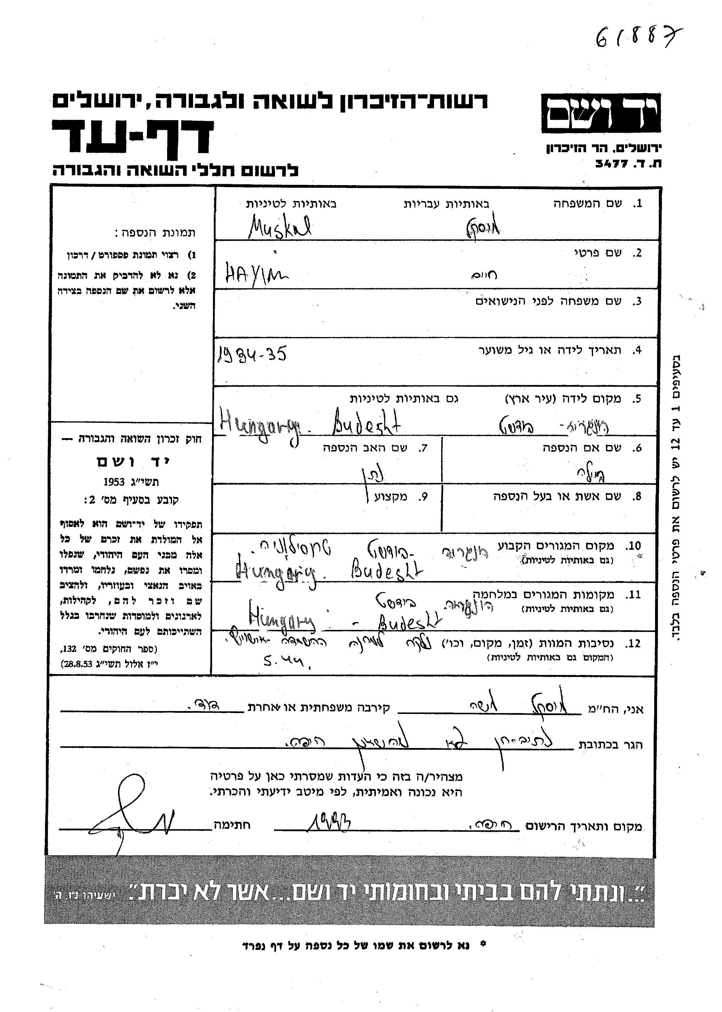 Muskal Hayim 1935 Budesti, Roumanie Feuille de témoignage