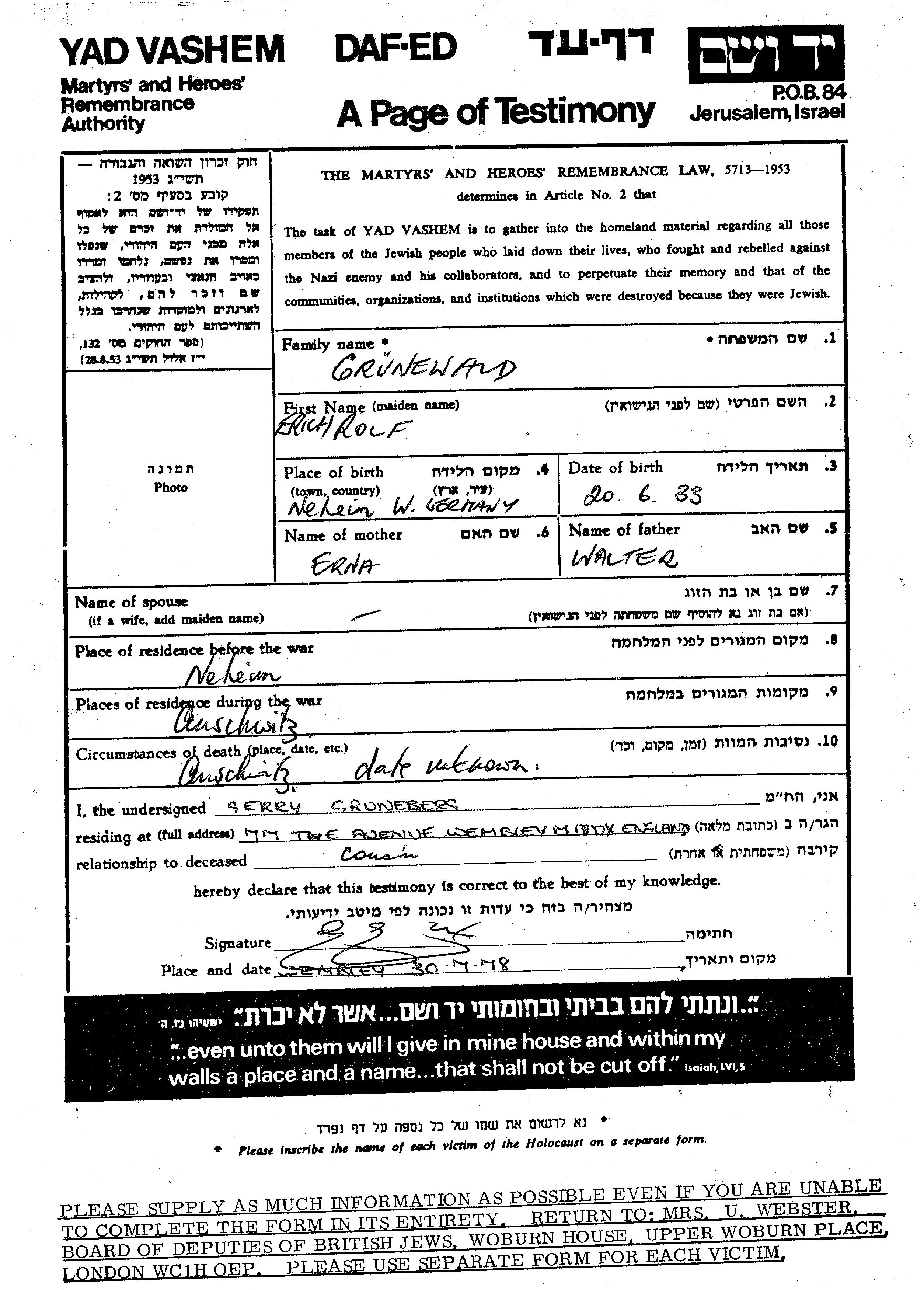 Grünewald Rolf Erich 1933 Neheim, Allemagne Feuille de témoignage
