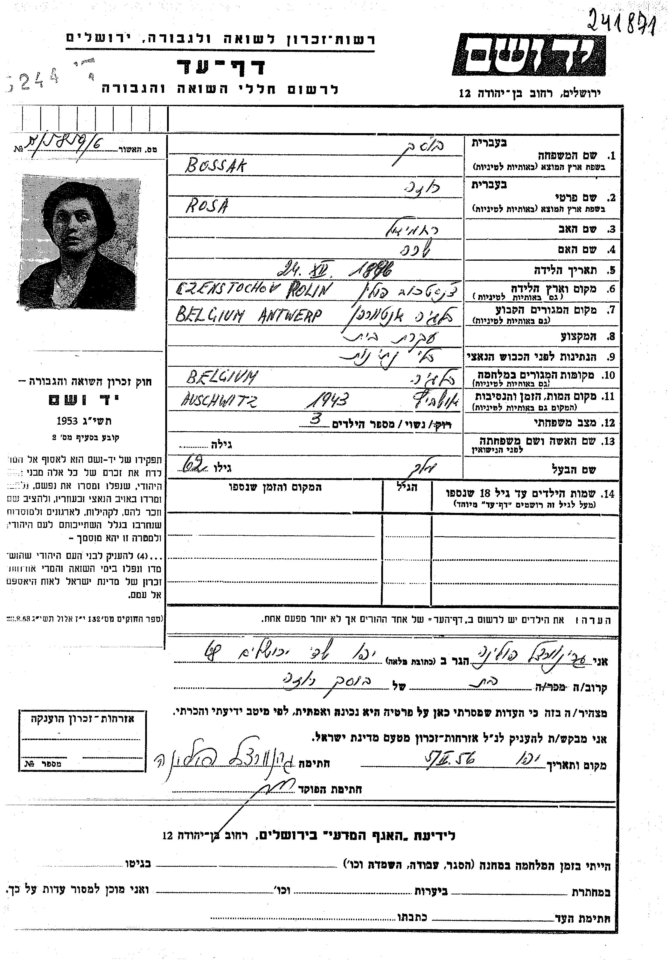Rosa Bossak est née à Czestochowa, Pologne en 1896. Elle était Femme au foyer. Avant la seconde guerre mondiale elle vivait à Antwerpen, Belgique.