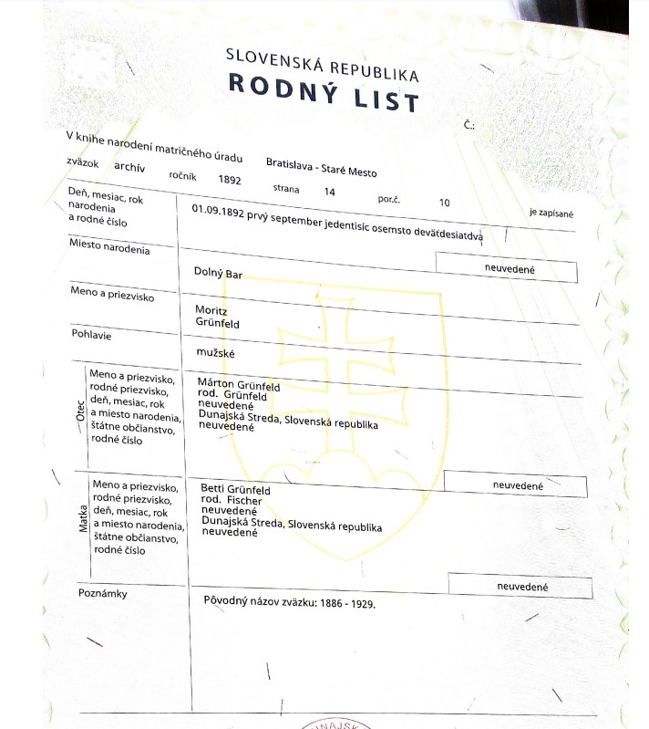 Grinfeld | Moritz | 1892 | Dunajska Streda, Tchécoslovaquie | Documents personnels |