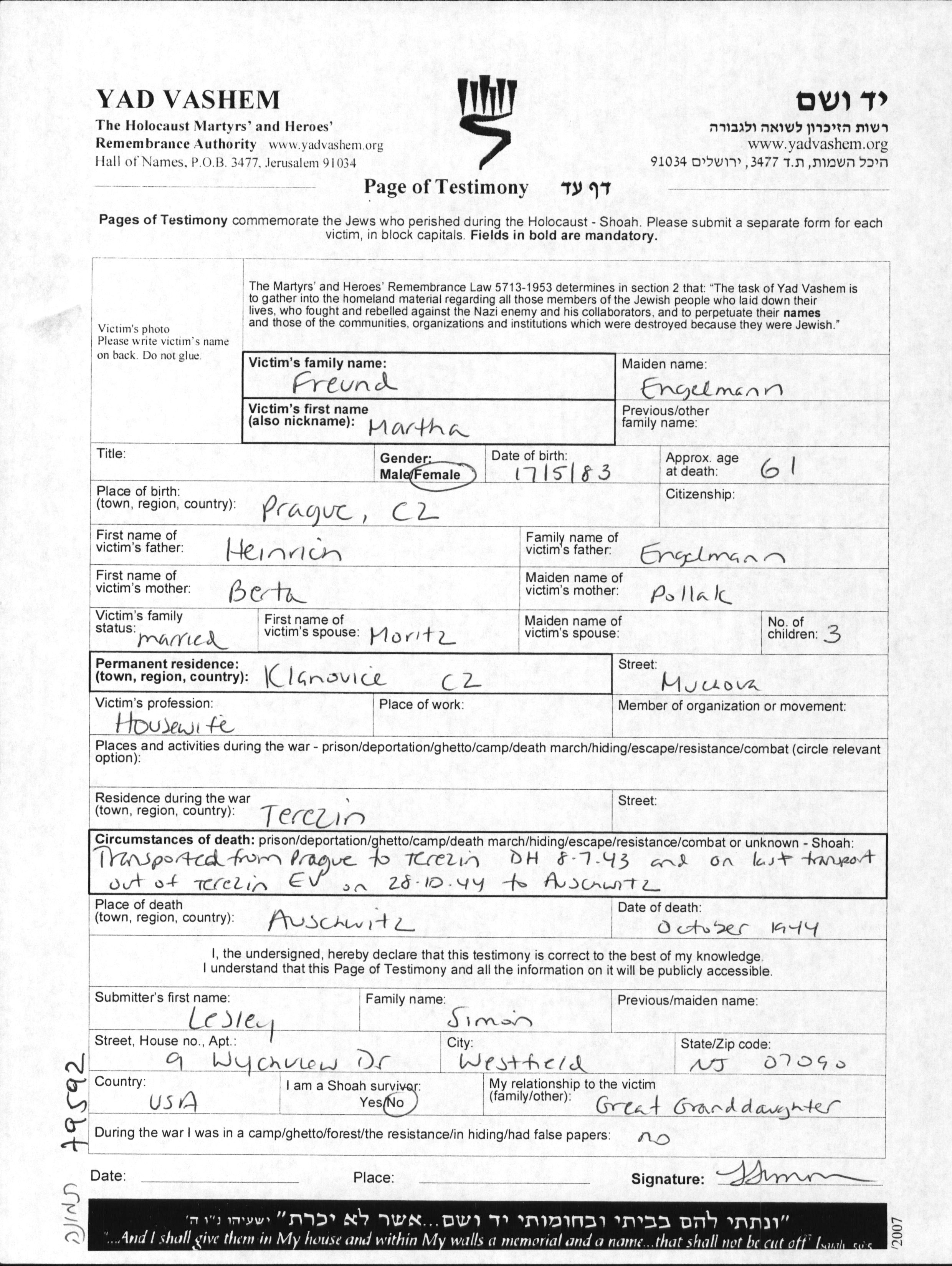 Freund | Marta | 1883 | Klanovice, Tchécoslovaquie | Feuille de témoignage |