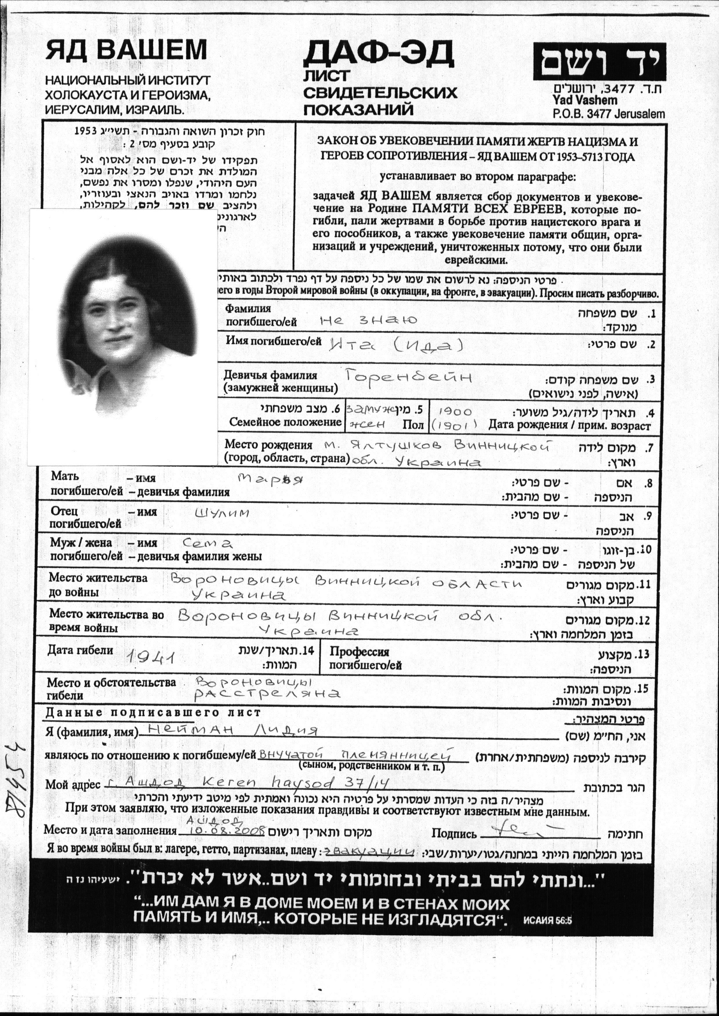 Ita Ida nom inconnu née Gorenbein est née à Yaltushkov, Ukraine (URSS) en 1900. Avant la seconde guerre mondiale elle vivait à Voronovitsa, Ukraine (URSS).