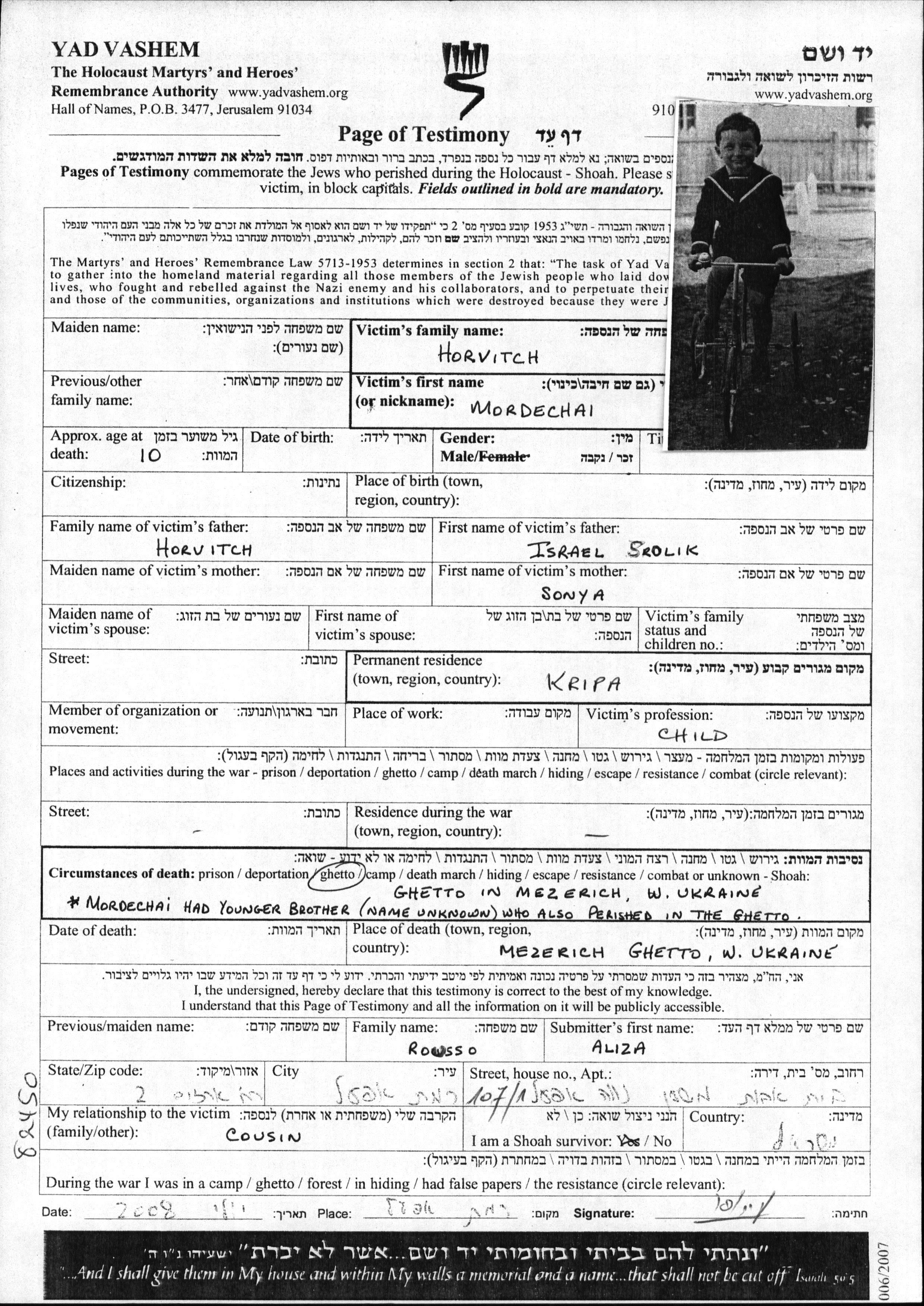 Mordechai a été assassiné pendant la Shoah. Lieu de la mort: Mezerich, Pologne.