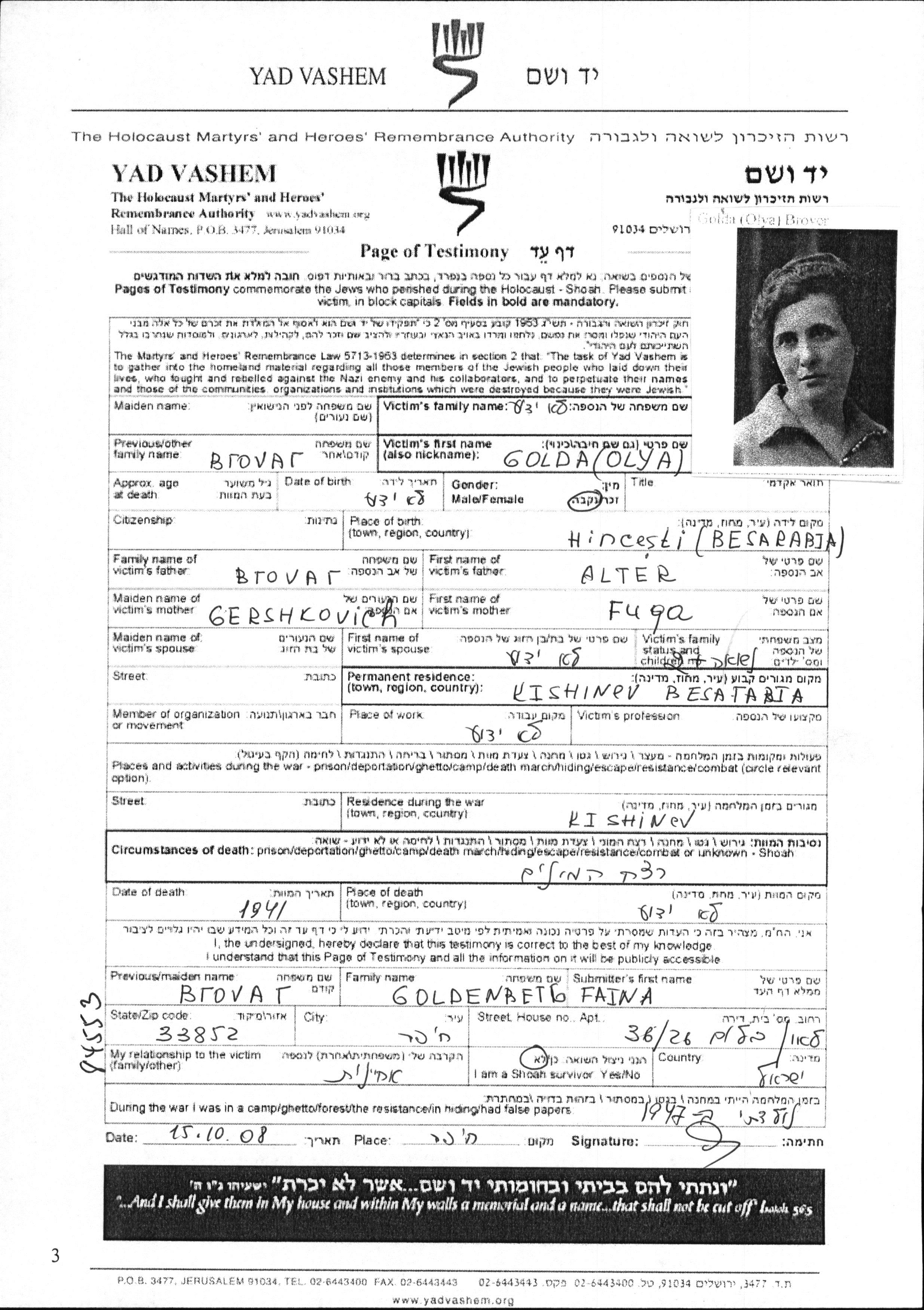 | nom inconnu | Golda Olya | Kishinev, Roumanie | Feuille de témoignage | |