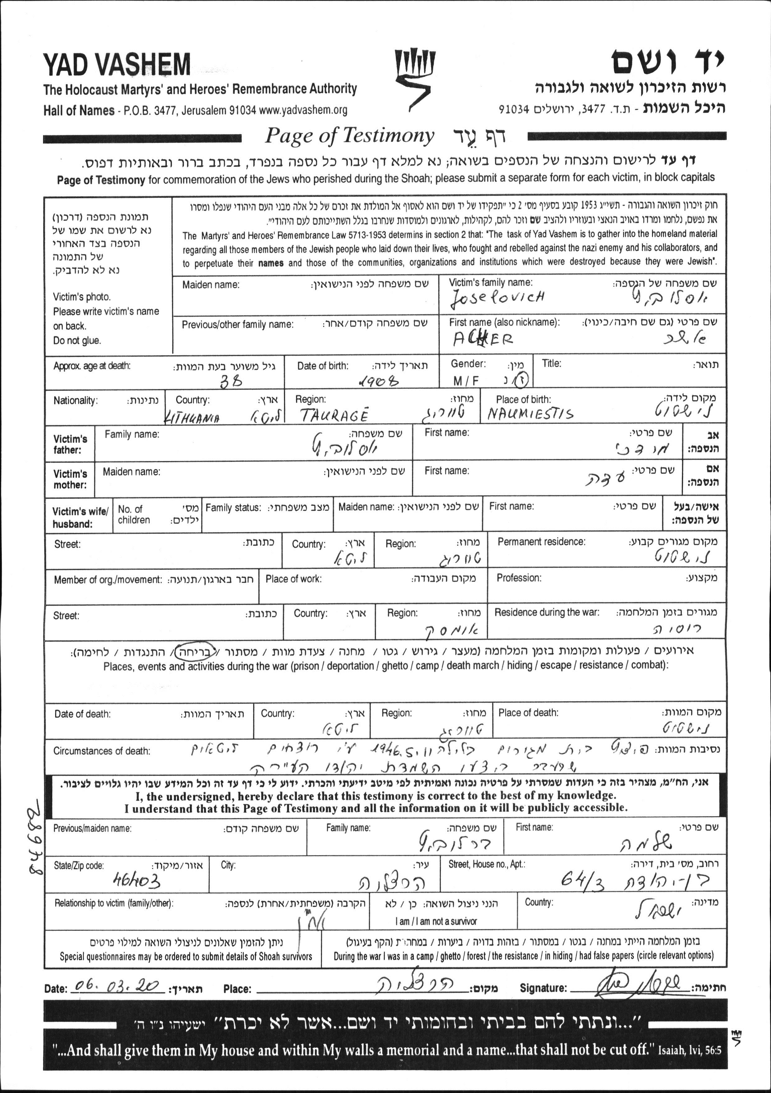 Joselovich | Acher | 1908 | Neustadt, Lituanie | Feuille de témoignage |