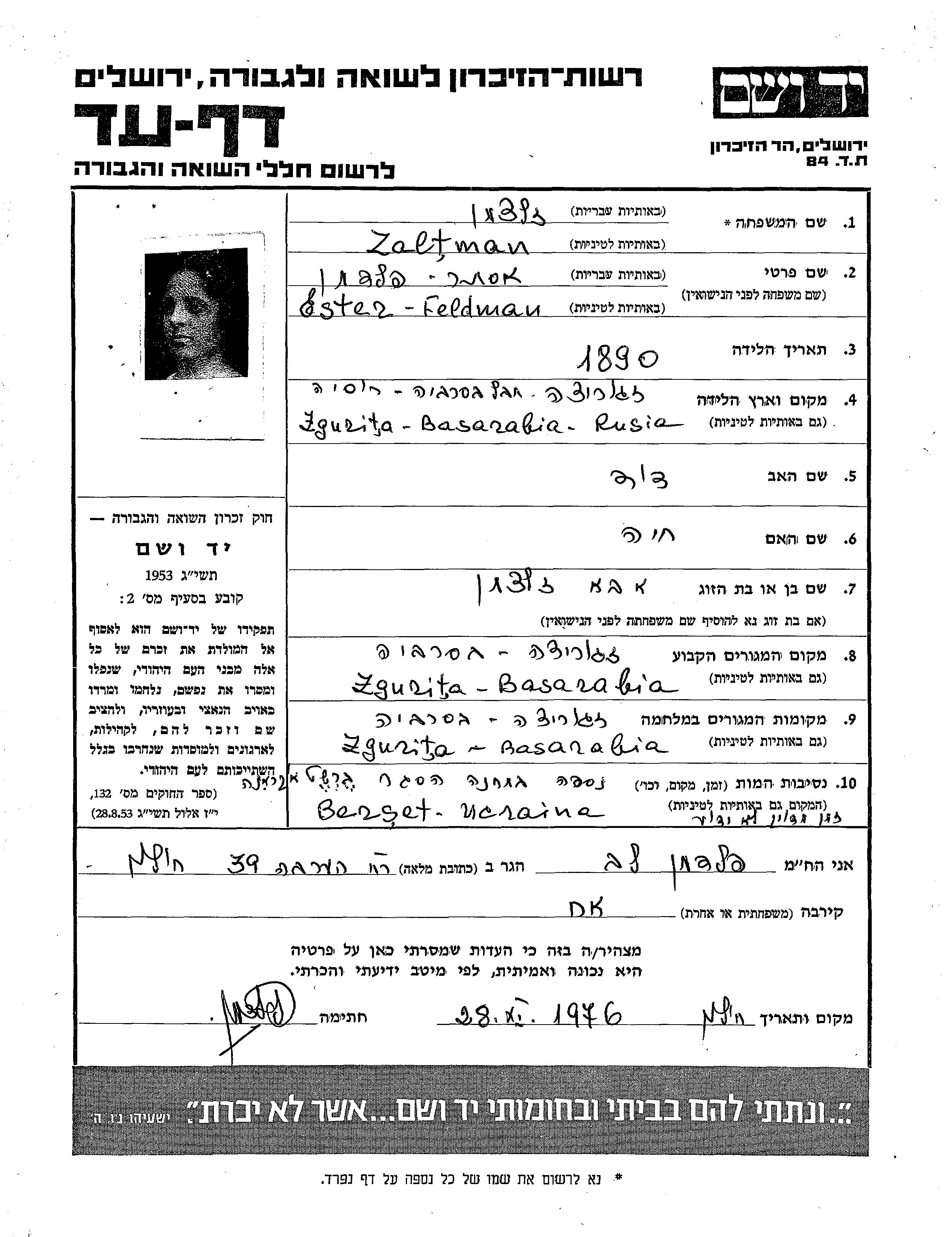 Ester Zaltman née Feldman est née à Zgurița, Roumanie en 1890. Avant la seconde guerre mondiale elle vivait à Zgurița, Roumanie.