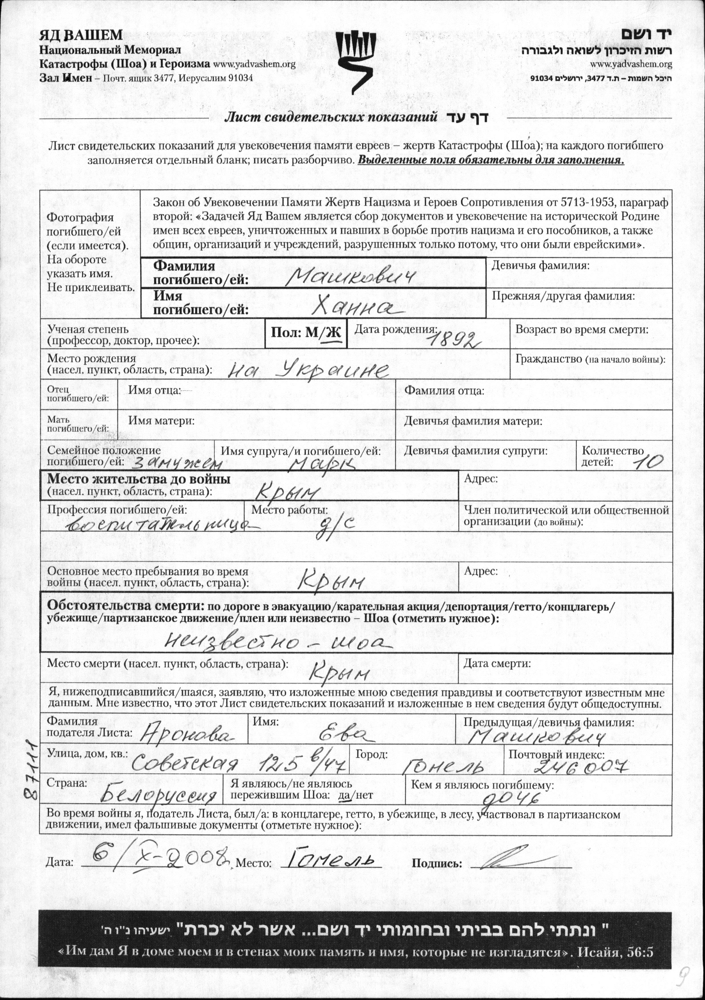 Khanna Mashkovich est née à Ukraine (URSS) en 1892. Elle était Enseignante d'école maternelle. Avant la seconde guerre mondiale elle vivait à Krym ASSR, Russie (URSS).