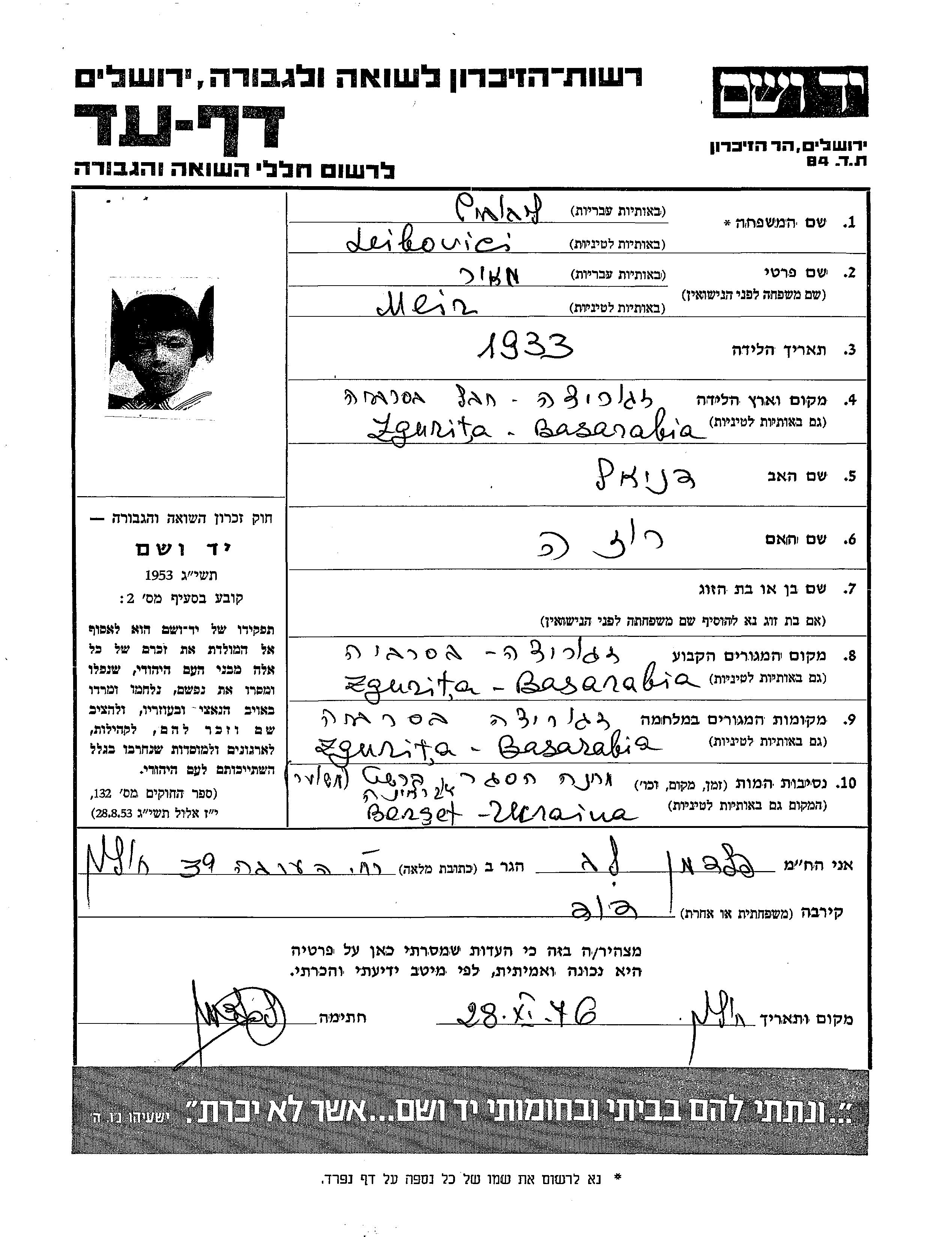 Leibovici Meir 1933 Zgurița, Roumanie Feuille de témoignage