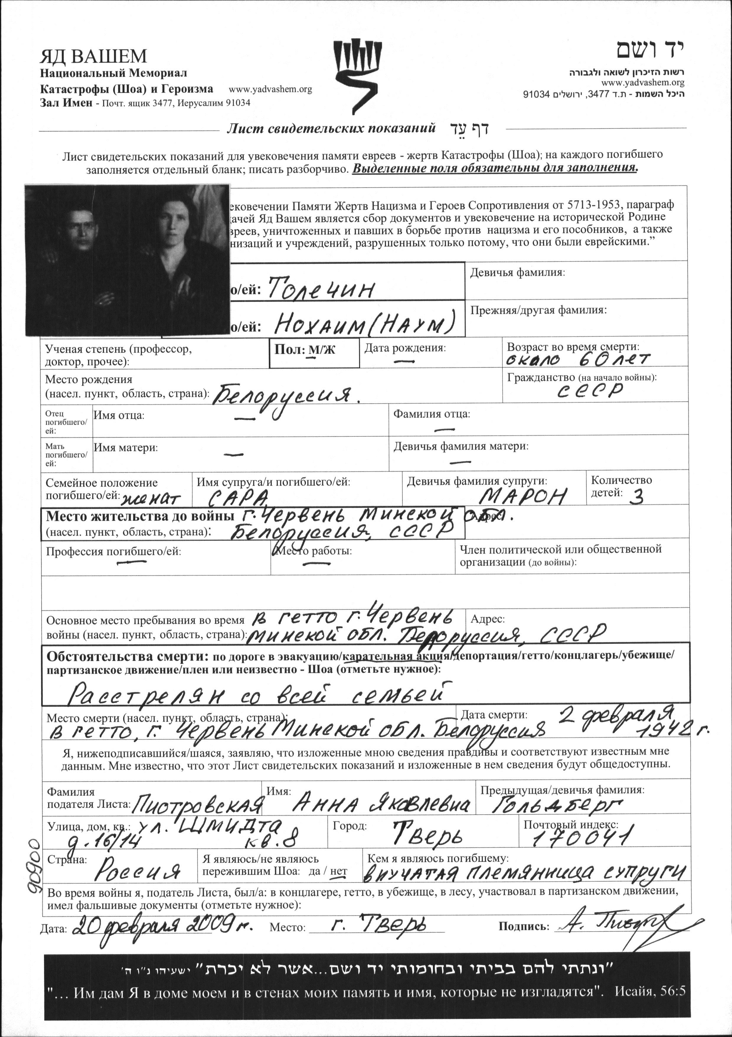 Tolechin | Nokhaim | Cherven, Bélorussie (URSS) | Feuille de témoignage | |