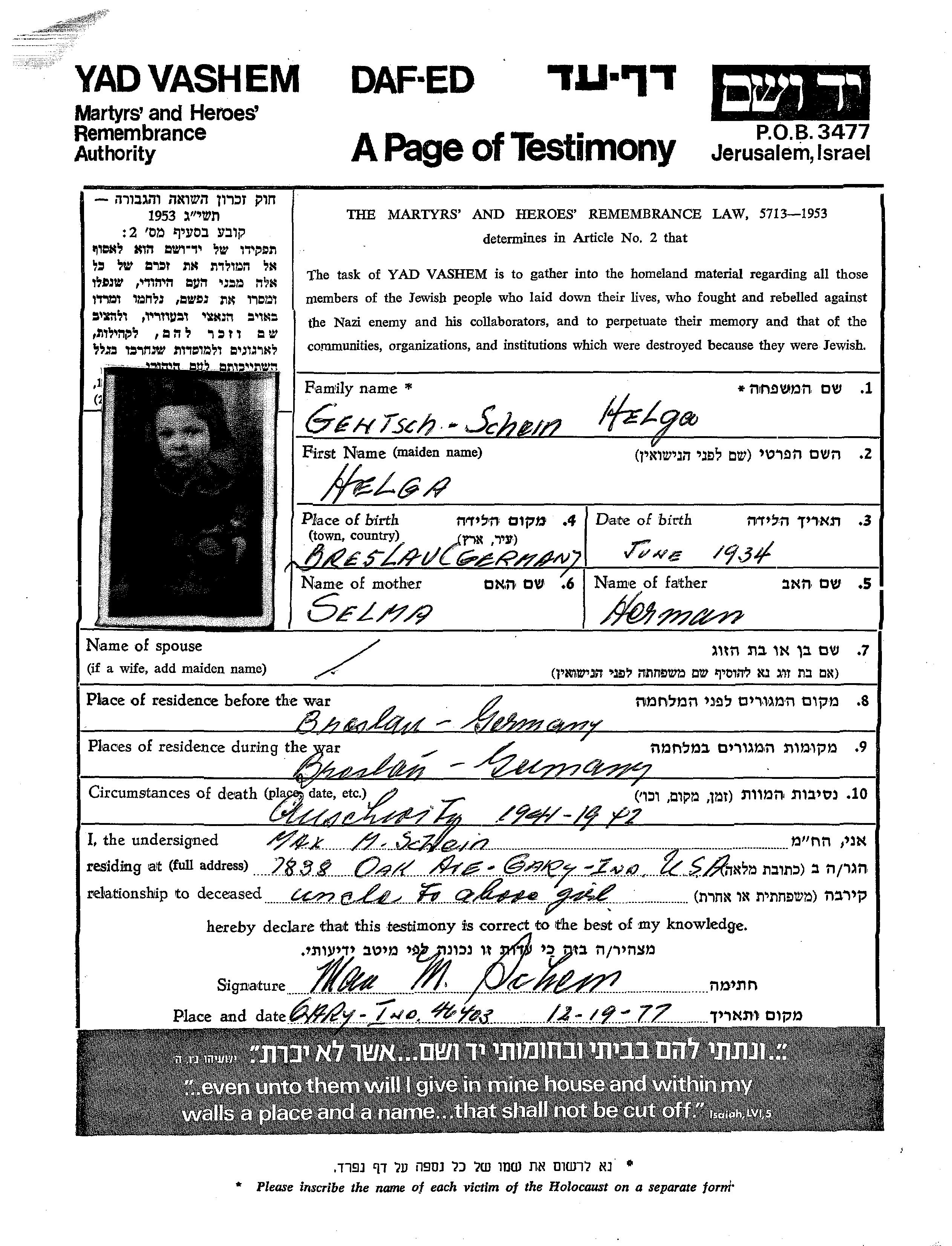 Helga Gentsch Schein est née à Breslau, Allemagne en 1934. Avant la seconde guerre mondiale elle vivait à Breslau, Allemagne.