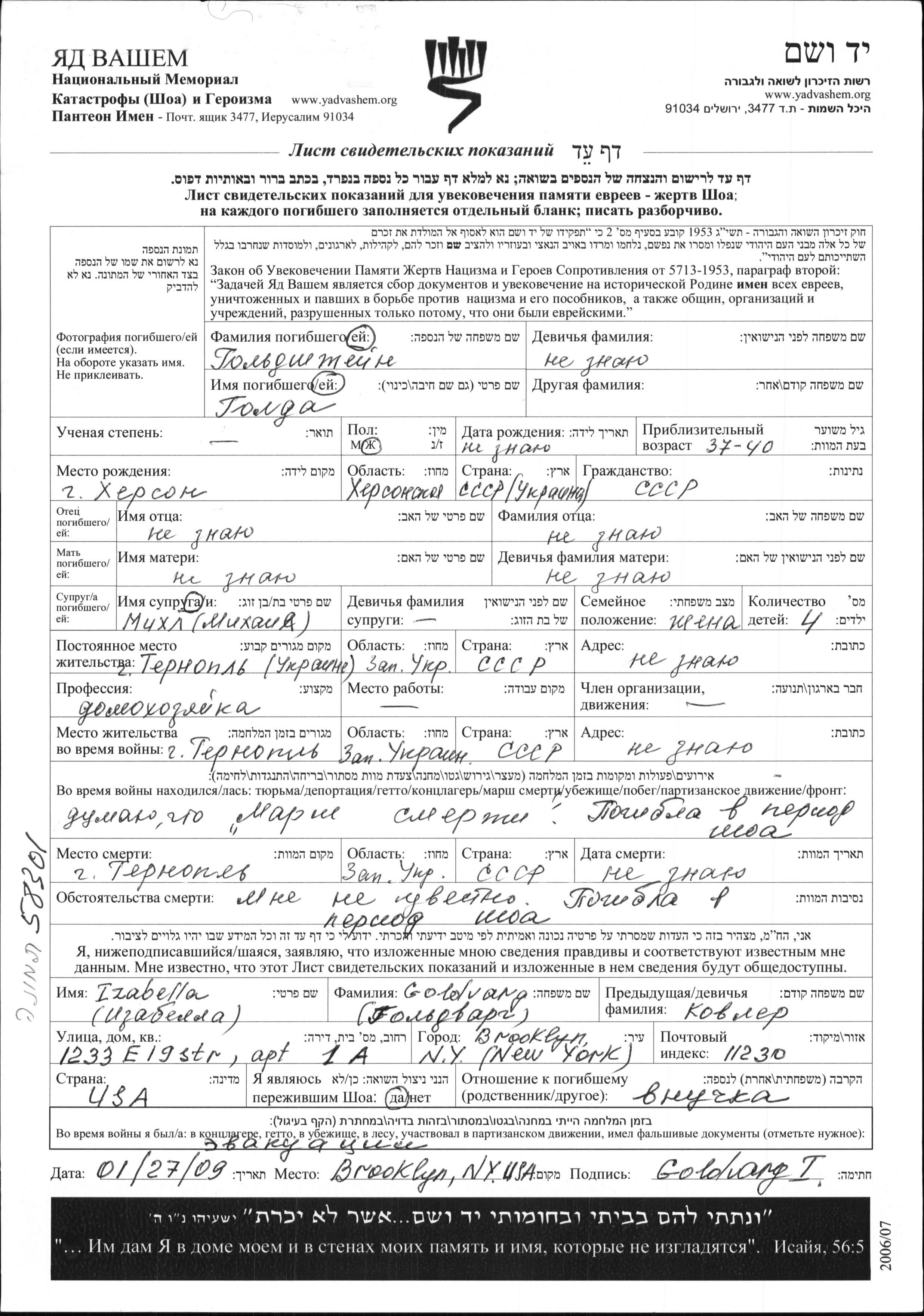 Goldshtein Golda Ternopol, Pologne Feuille de témoignage