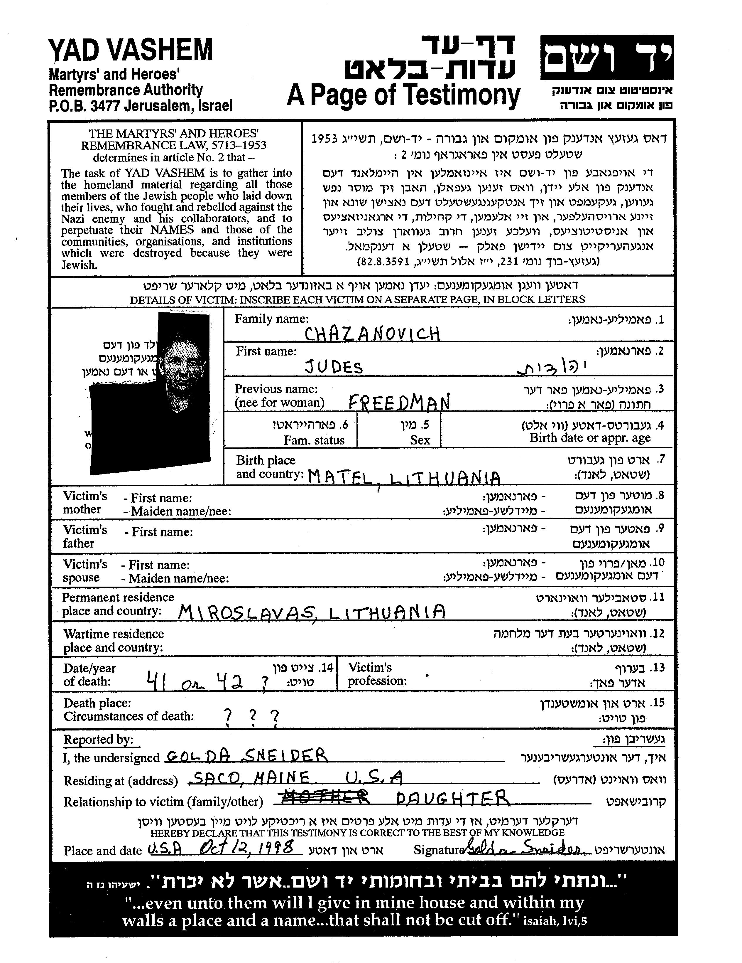 Chazanovich | Judes | Miroslavas, Lituanie | Feuille de témoignage | |
