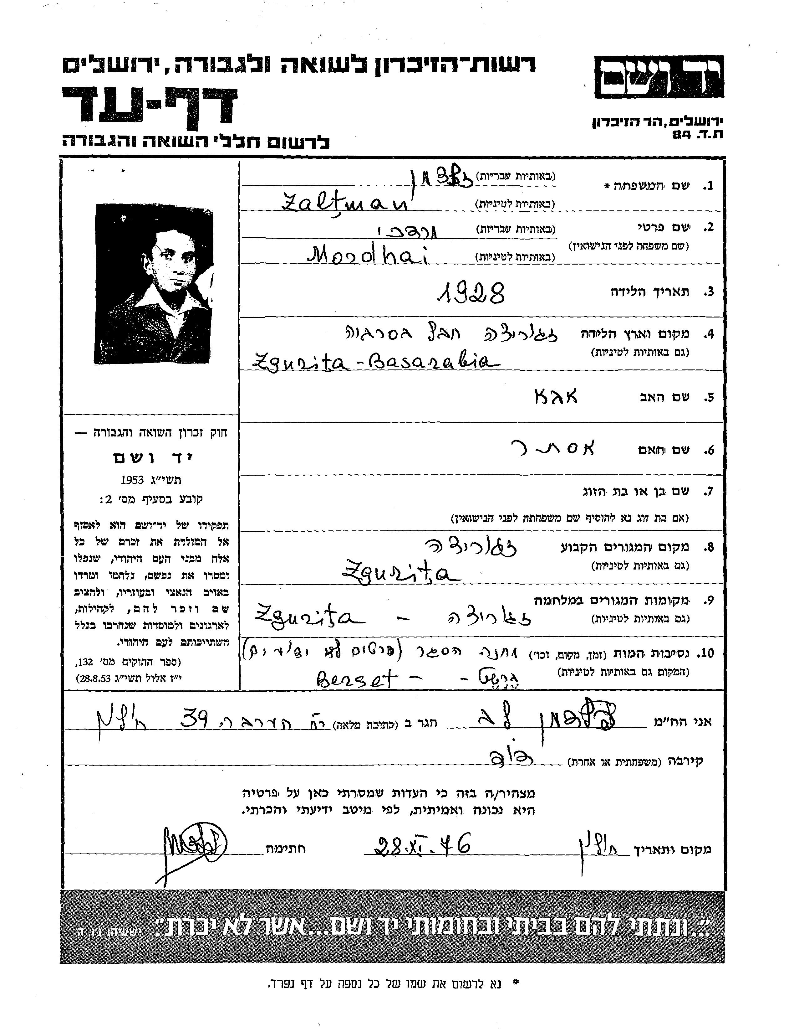 Zaltman Mordhai 1928 Zgurița, Roumanie Feuille de témoignage