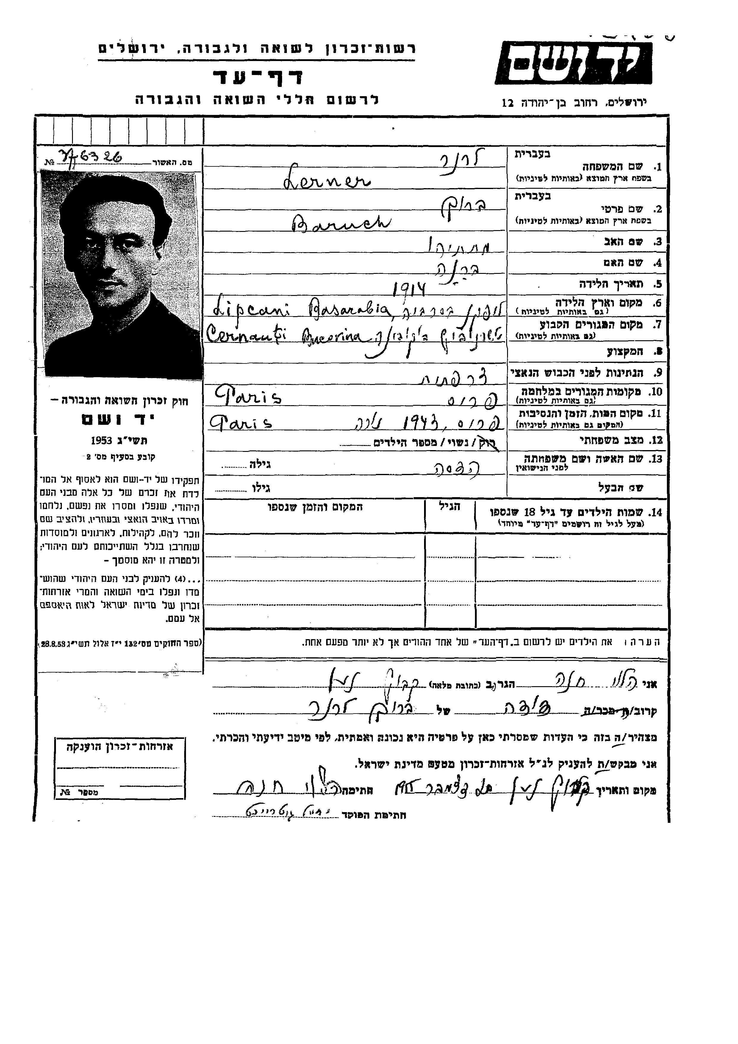 Lerner Baruch 1914 Cernauti, Roumanie Feuille de témoignage