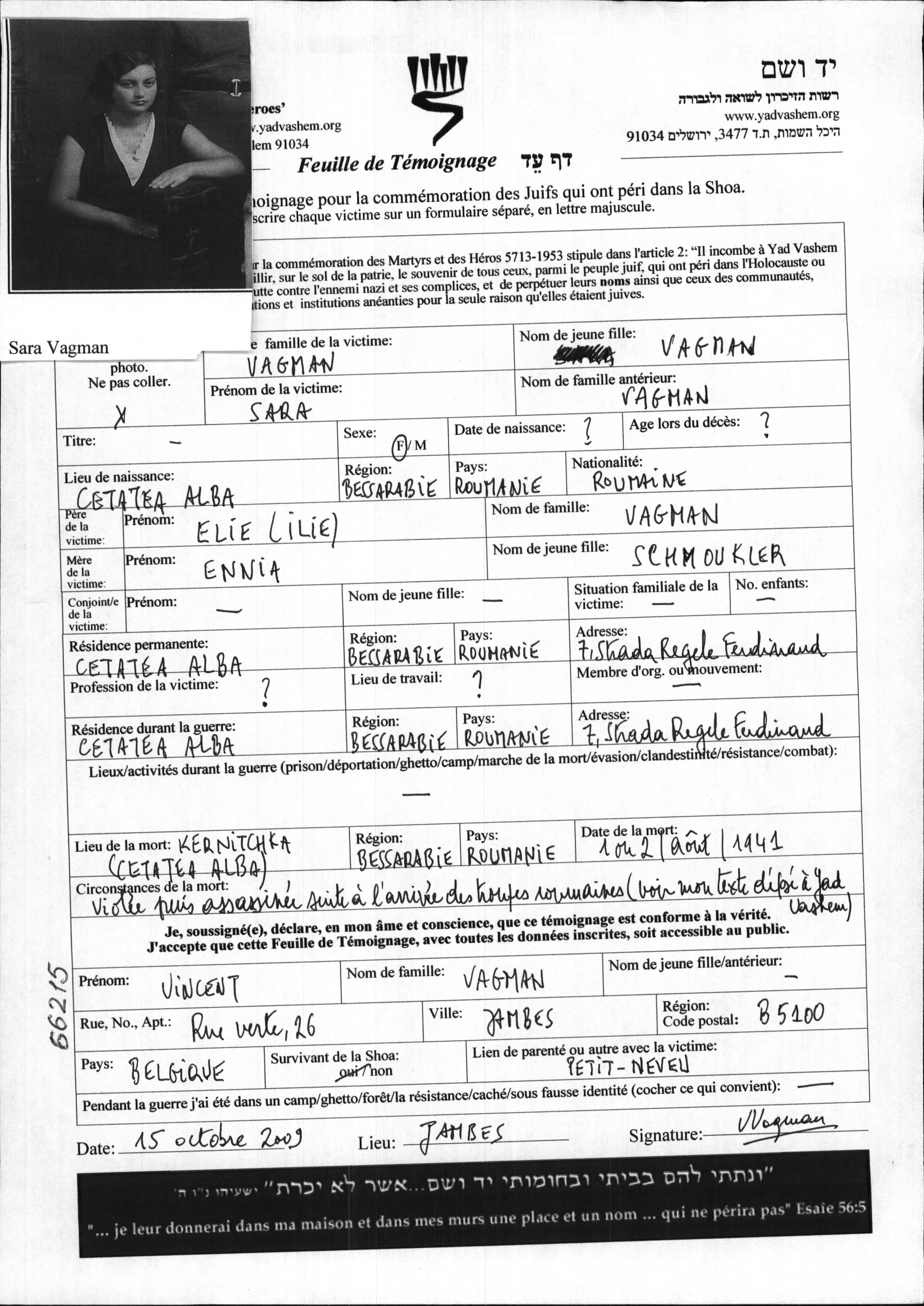Vagman Sara Cetatea Alba, Roumanie Feuille de témoignage