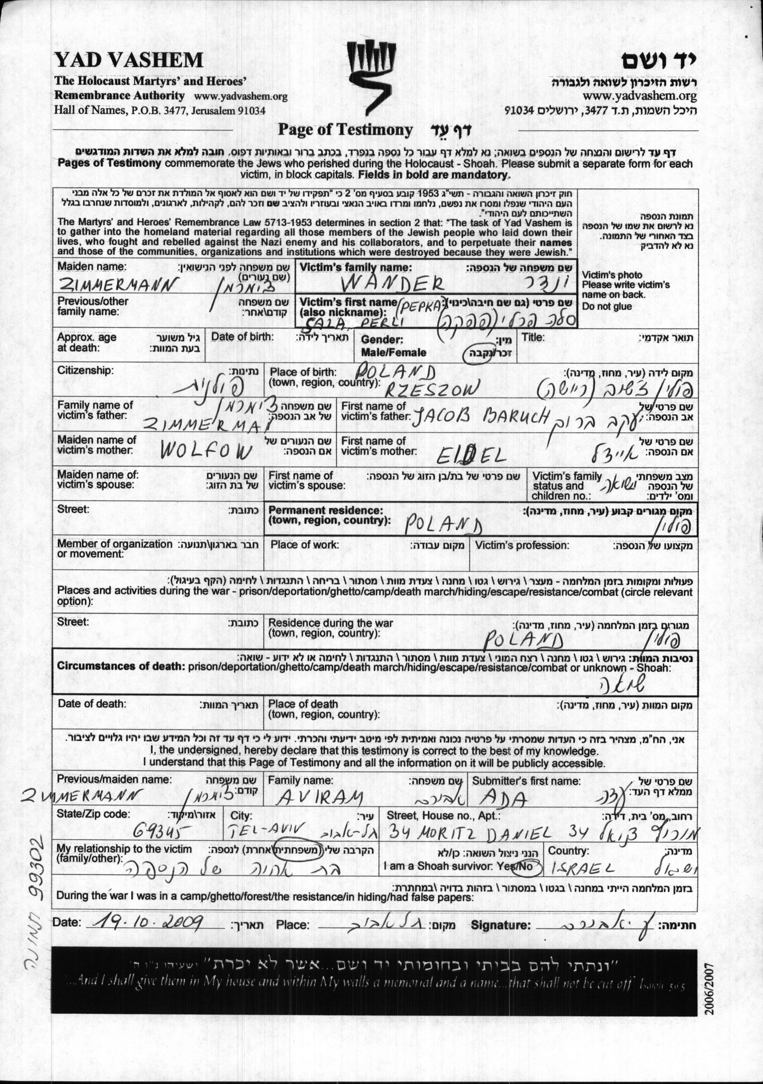 Sala Perli Pepka Wander née Zimmermann est née à Rzeszow, Pologne. Avant la seconde guerre mondiale elle vivait à Pologne.