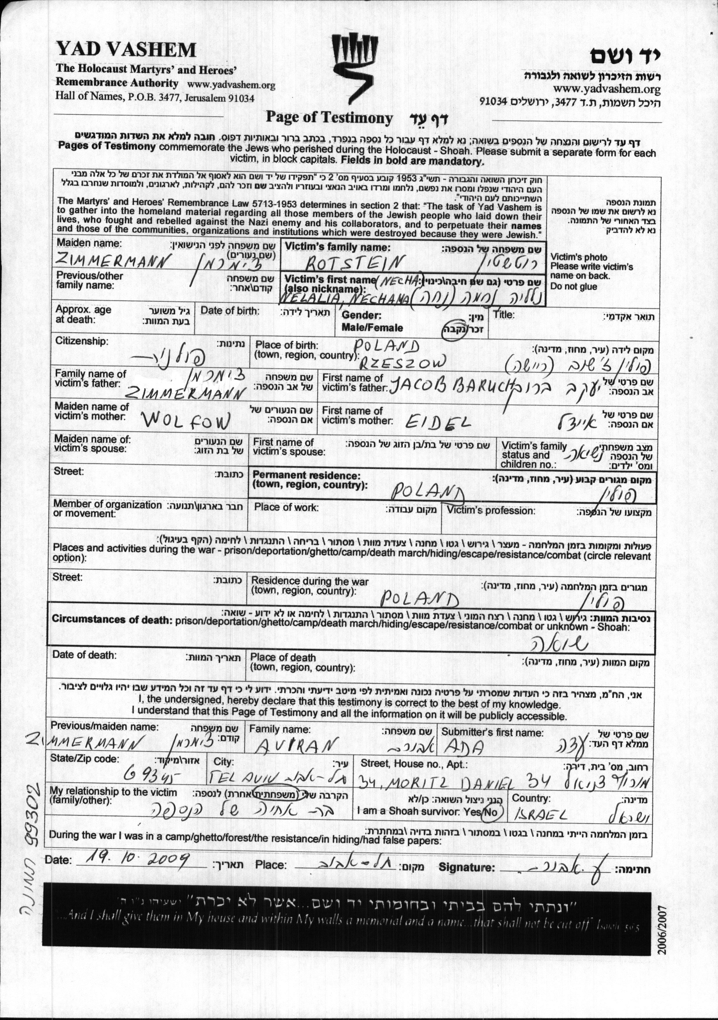 Rotstein Nechama Nelalia Pologne Feuille de témoignage
