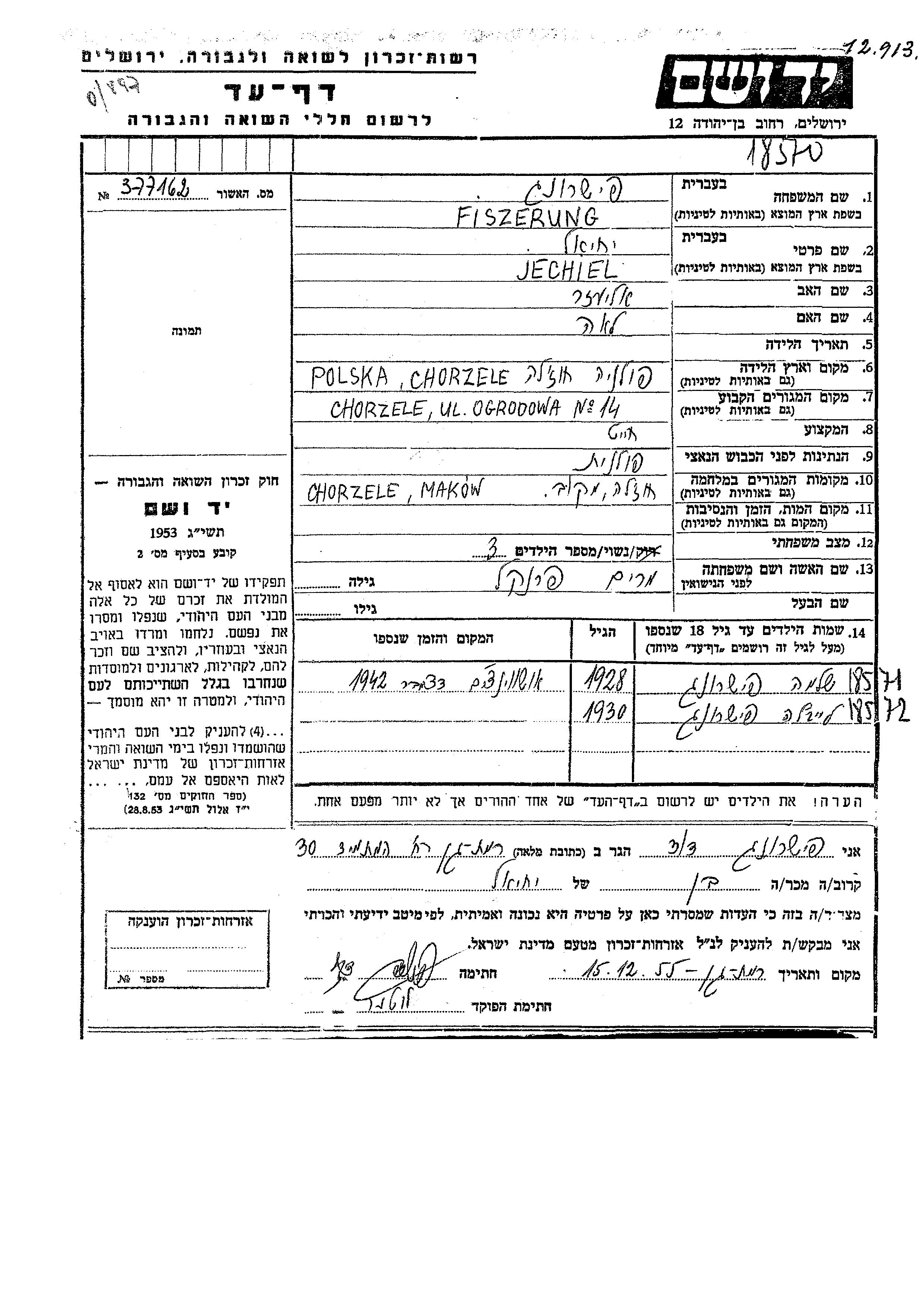 Fiszerung Leibele 1930 Chorzele, Pologne Feuille de témoignage