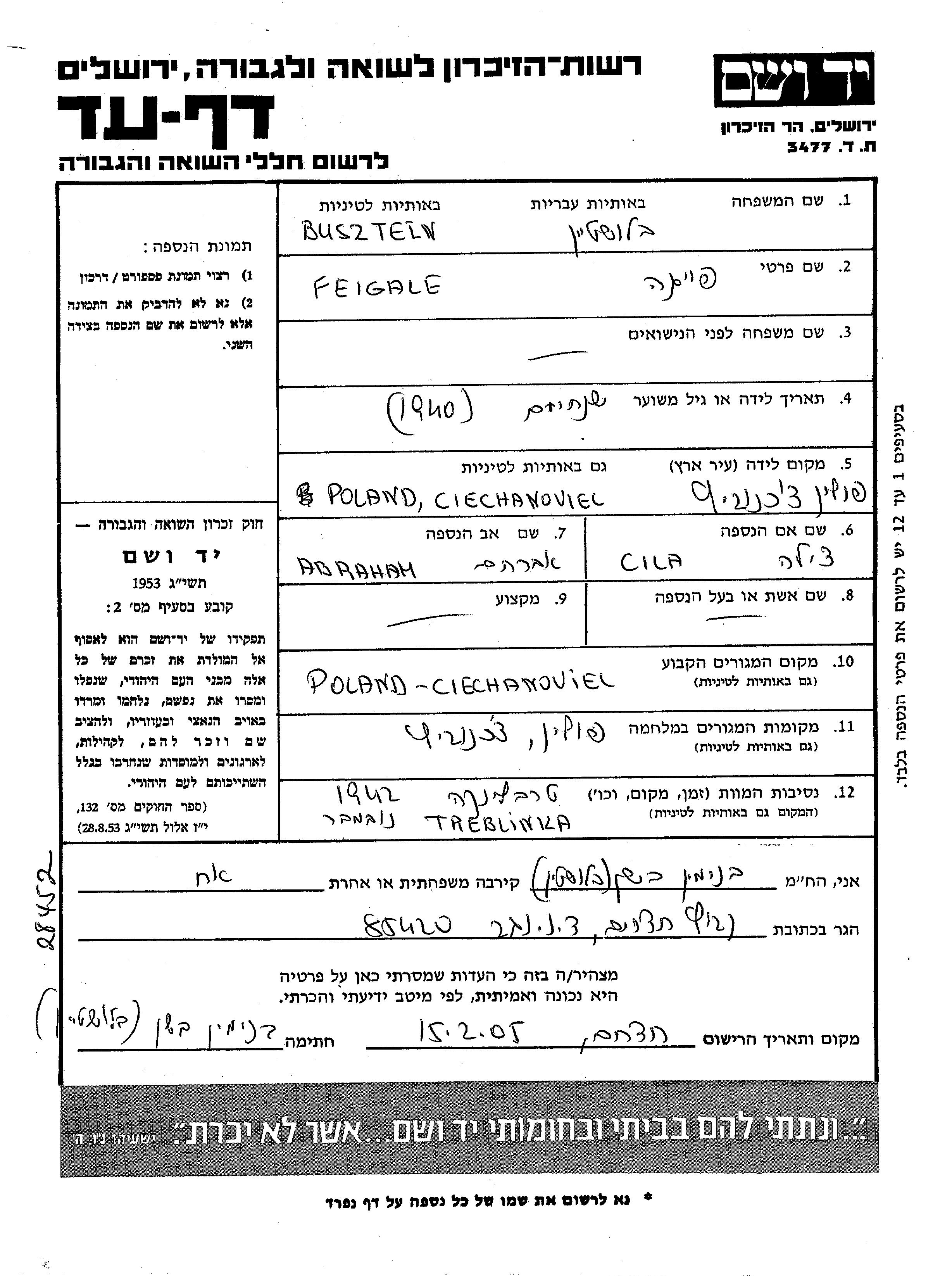 Blusztein Feiga 1940 Ciechanoviec, Pologne Feuille de témoignage