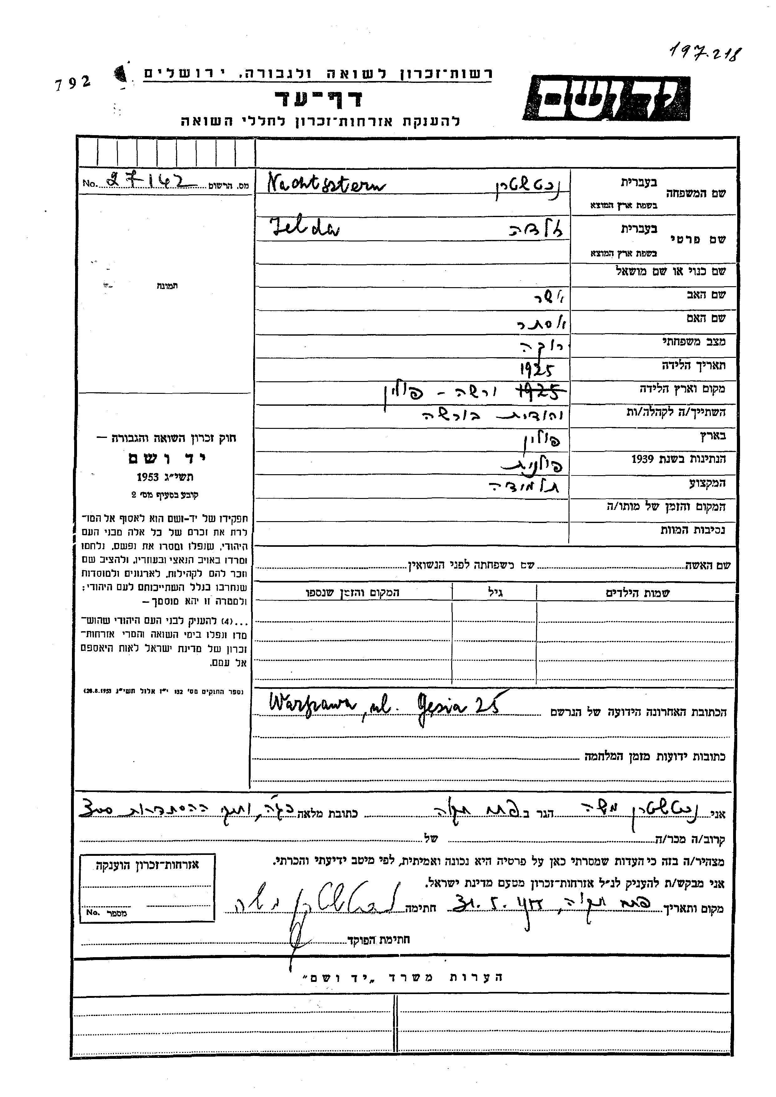 Nachtsztern Zelda 1925 Varsha, Pologne Feuille de témoignage