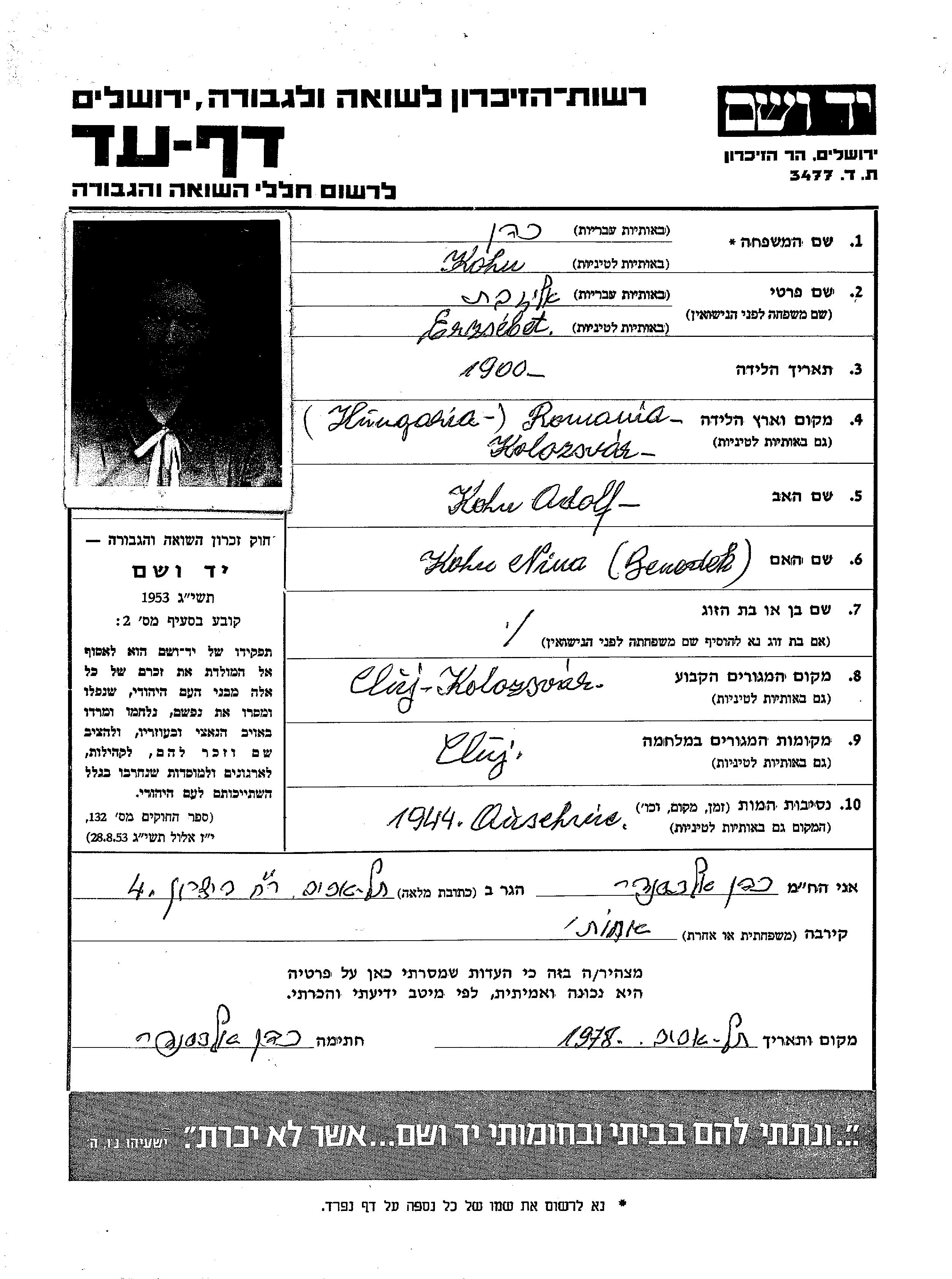 Erzsebet Kohn est née à Cluj, Roumanie en 1900. Avant la seconde guerre mondiale elle vivait à Cluj, Roumanie.