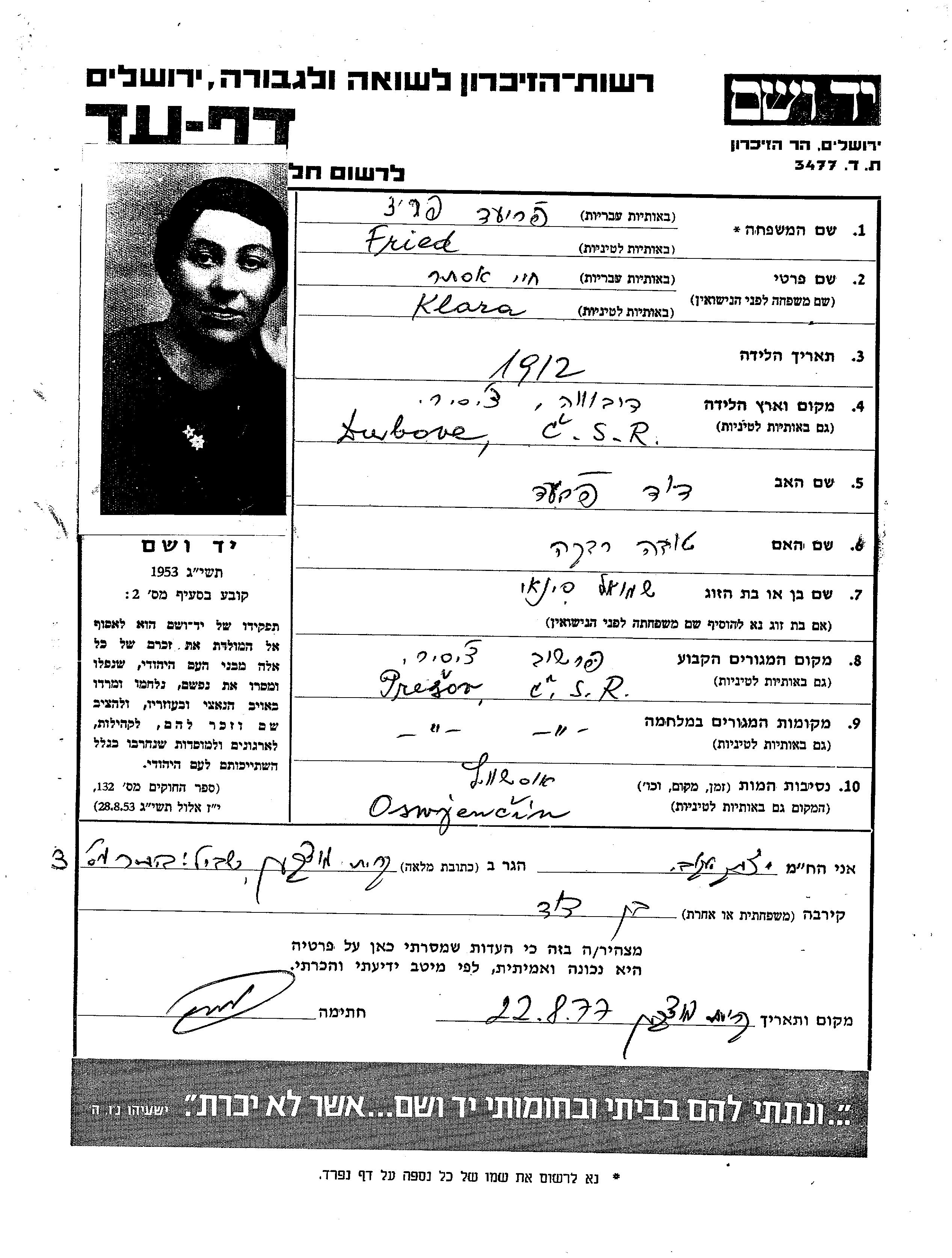 Fried Klara Khai Ester 1912 Presov, Tchécoslovaquie Feuille de témoignage