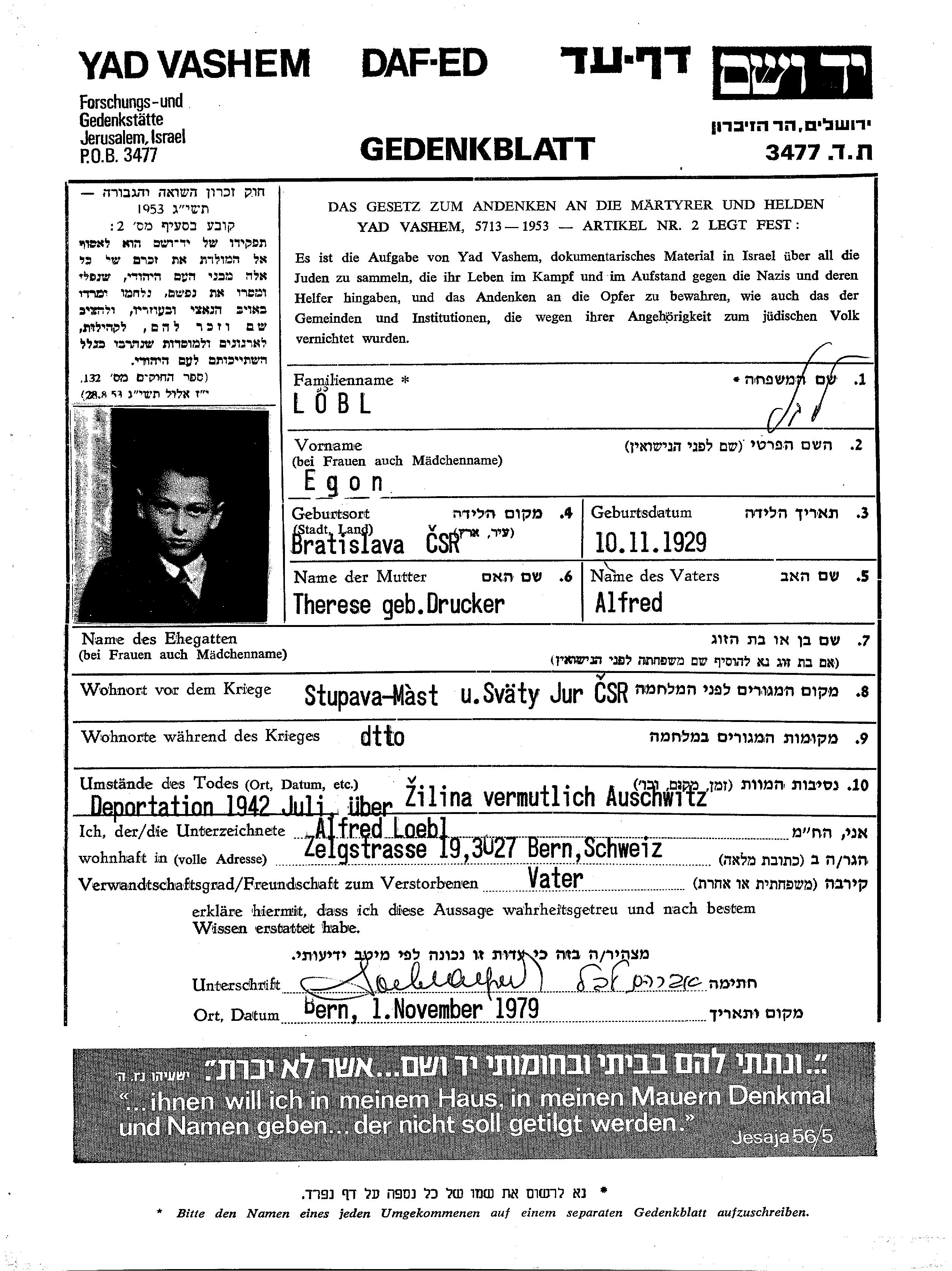 Lobl | Egon | 1929 | Svaty Jur, Tchécoslovaquie | Feuille de témoignage |