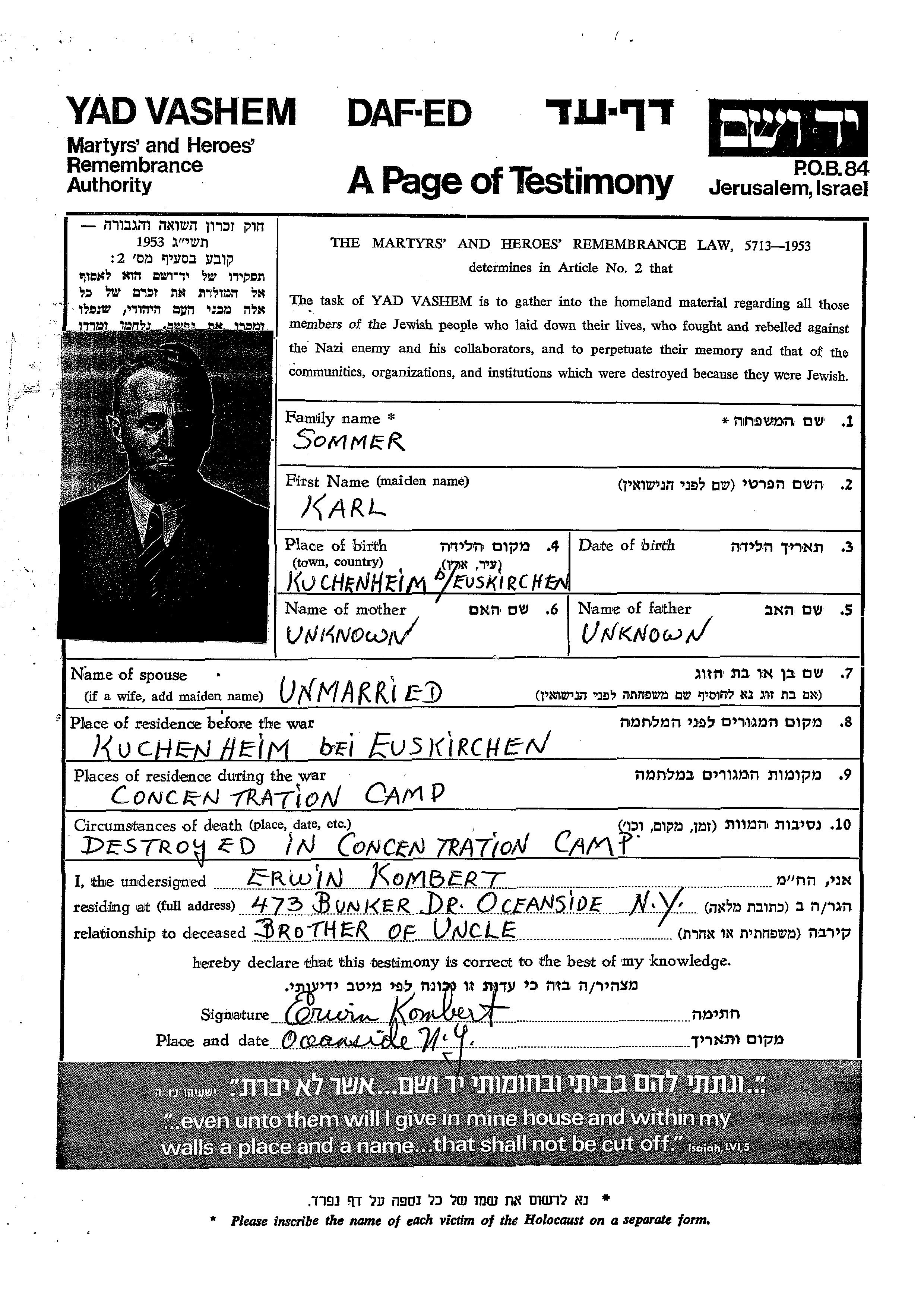 Karl Sommer est né à Euskirchen, Allemagne. Avant la seconde guerre mondiale il vivait à Euskirchen, Allemagne.