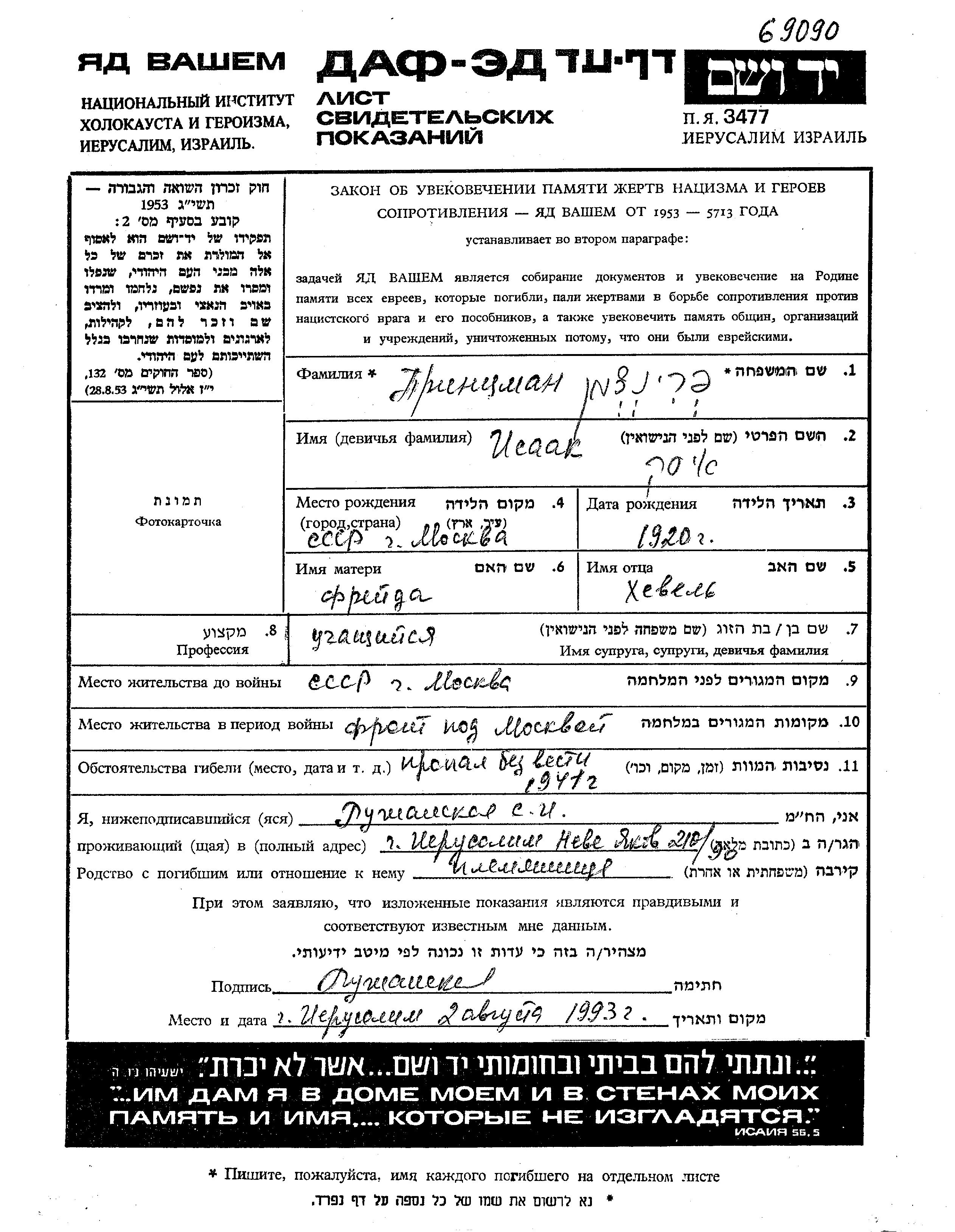 Isaak Printzman est né à Moskva, Russie (URSS) en 1920, fils de Khevel et de Freida. Il était Élève. Avant la seconde guerre mondiale il vivait à Moskva, Russie (URSS). Au cours de la guerre, il était à the Soviet armed forces.